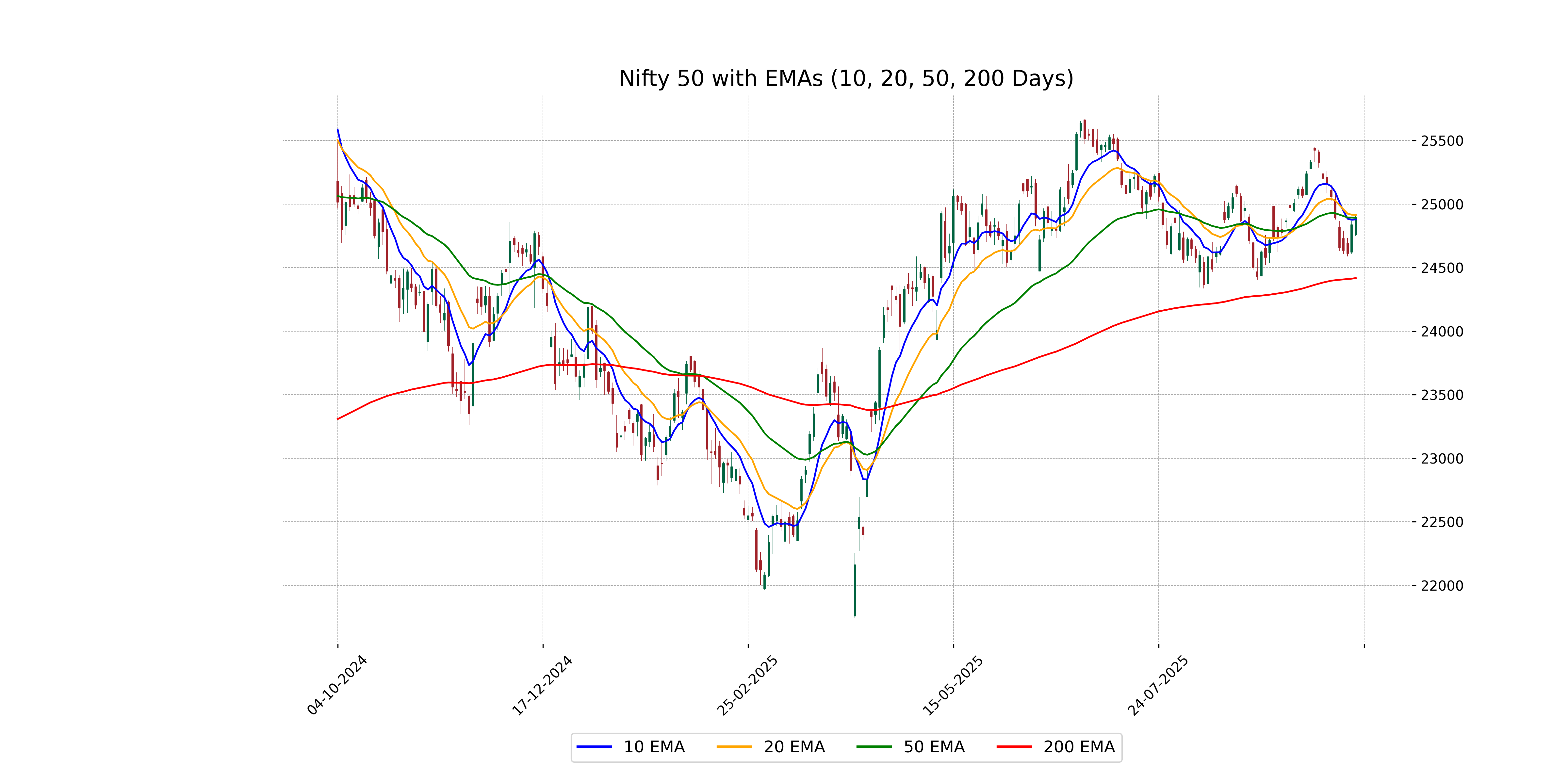 The Nifty 50 closed at 24,894.25, which is slightly above its 50-day EMA of 24,892.57 but below its 20-day EMA of 24,914.39. This suggests a neutral position relative to short-term trends but might indicate potential resistance near the 20-day EMA.