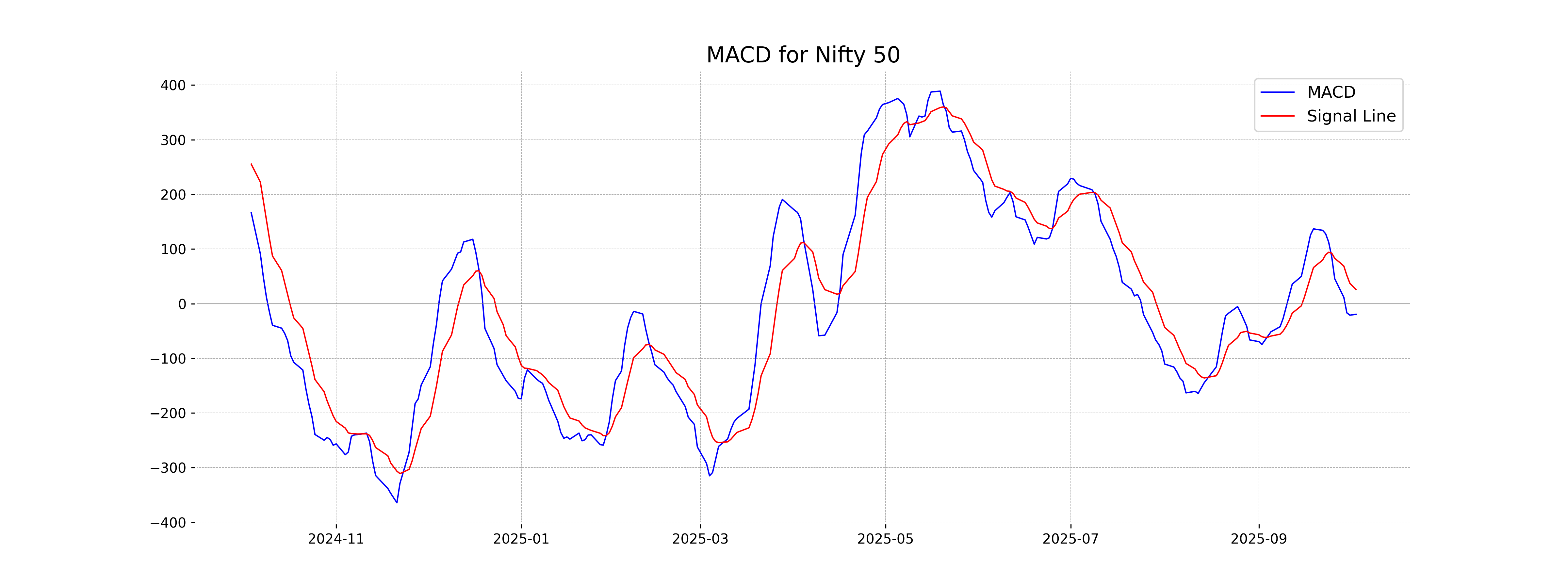The Nifty 50 has a negative MACD of -19.56, suggesting a bearish trend as the MACD is below the signal line, which stands at 25.80. However, the relatively close range between the MACD and the signal line indicates the potential for a reversal or consolidation in the near future.