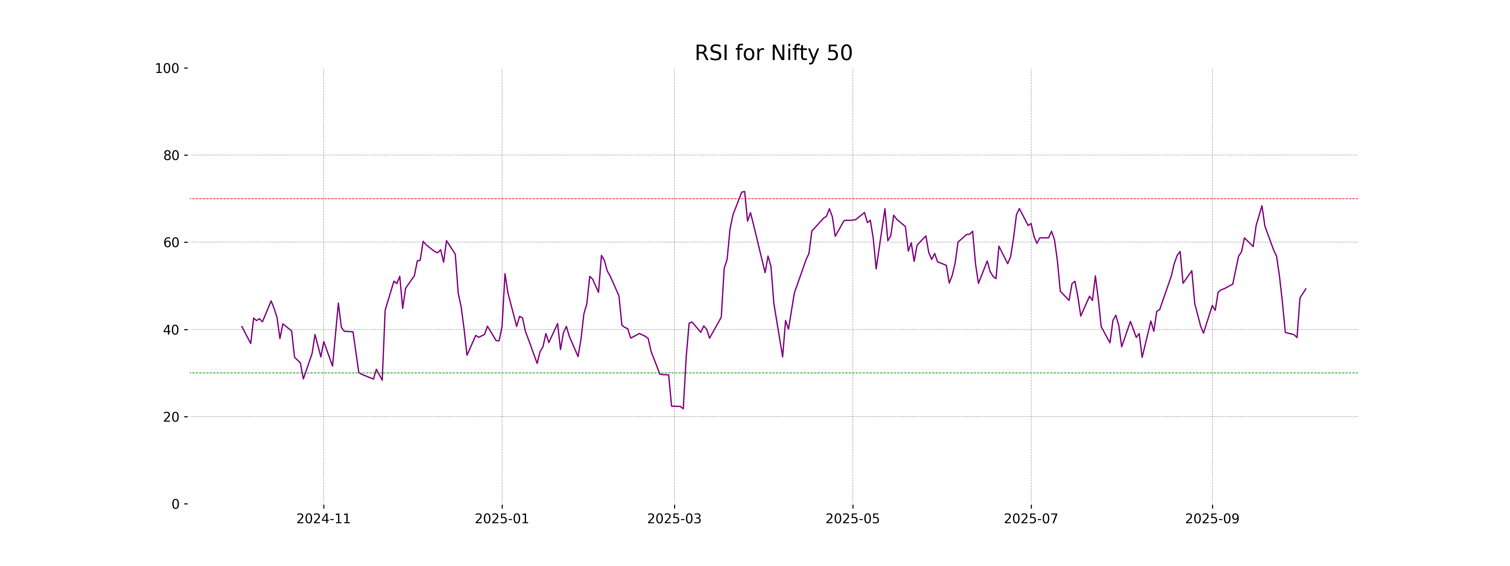 The Nifty 50 index opened at 24,759.55 and closed at 24,894.25, marking a slight increase of 0.23%. The index had a day's high of 24,904.80 and a low of 24,747.55. Despite the positive close, the MACD indicates bearish momentum, and the RSI is at 49.29, suggesting a neutral trend.