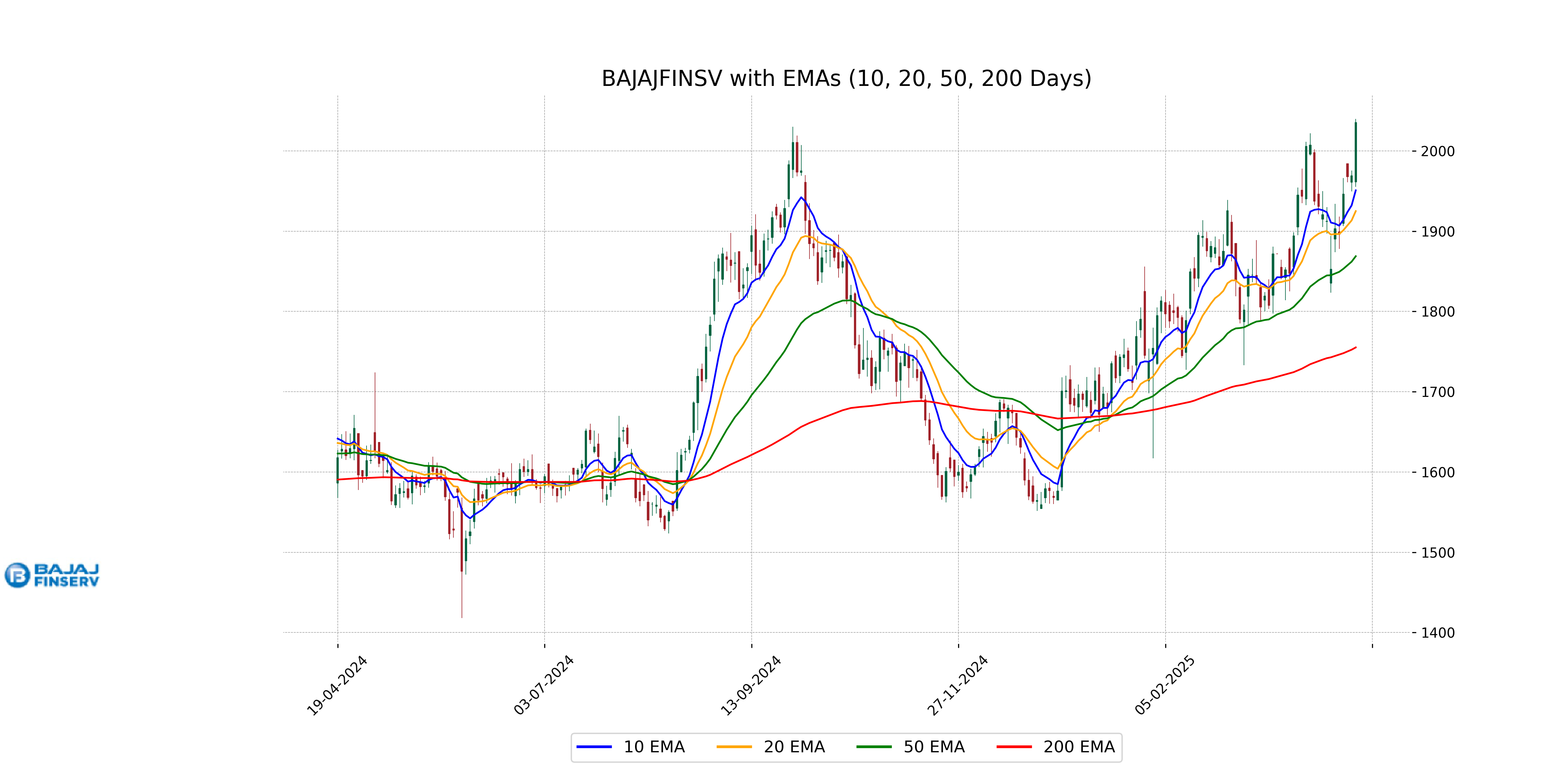 Bajaj Finserv's current close price of 2035.30 is above its 10-day, 20-day, 50-day, and 200-day exponential moving averages (EMAs), which are 1950.86, 1924.98, 1868.78, and 1755.16 respectively. This indicates a strong upward momentum in the stock price, well above all the key moving averages.