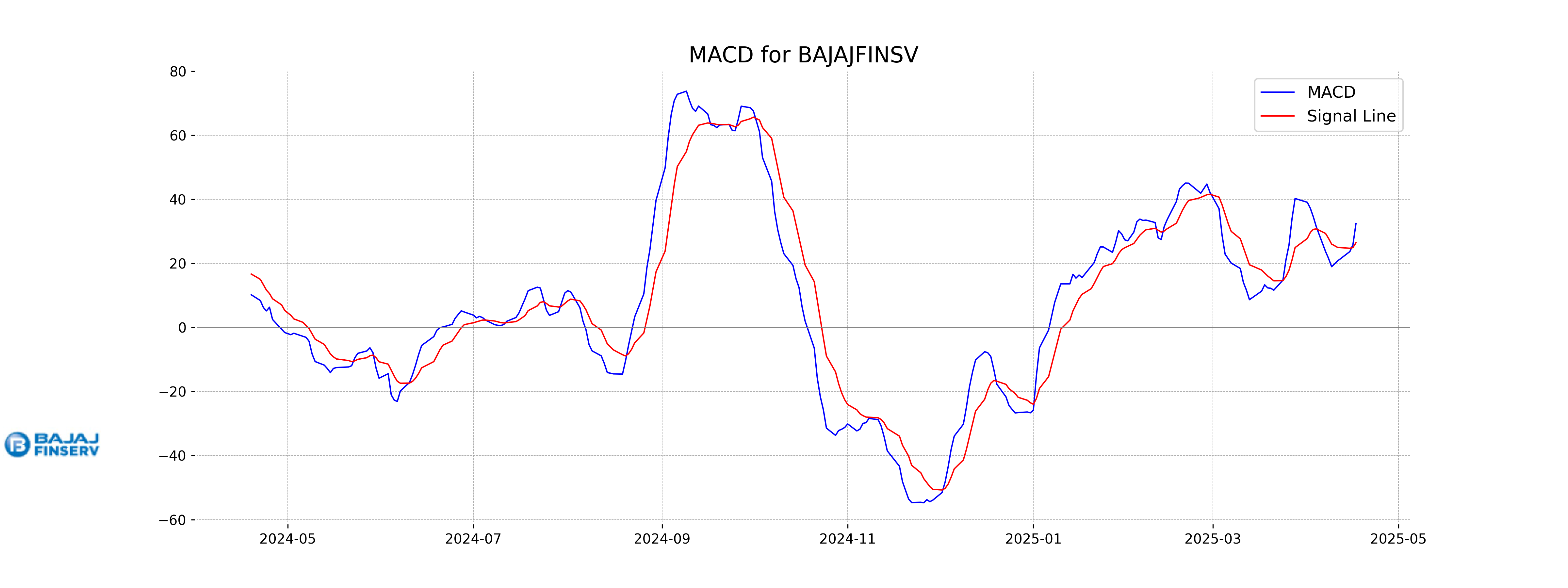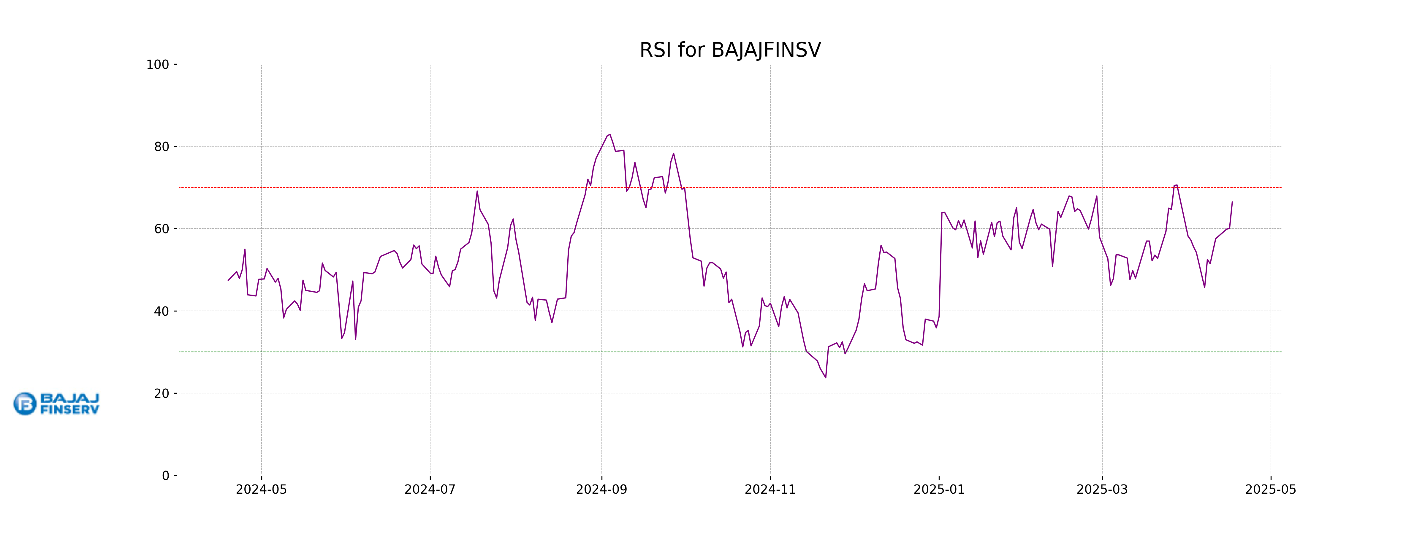 Bajaj Finserv's Relative Strength Index (RSI) is at 66.47, which suggests that the stock is nearing the overbought territory typically considered to be above 70. Investors should watch for potential pullbacks or consolidations as the RSI approaches these higher levels.