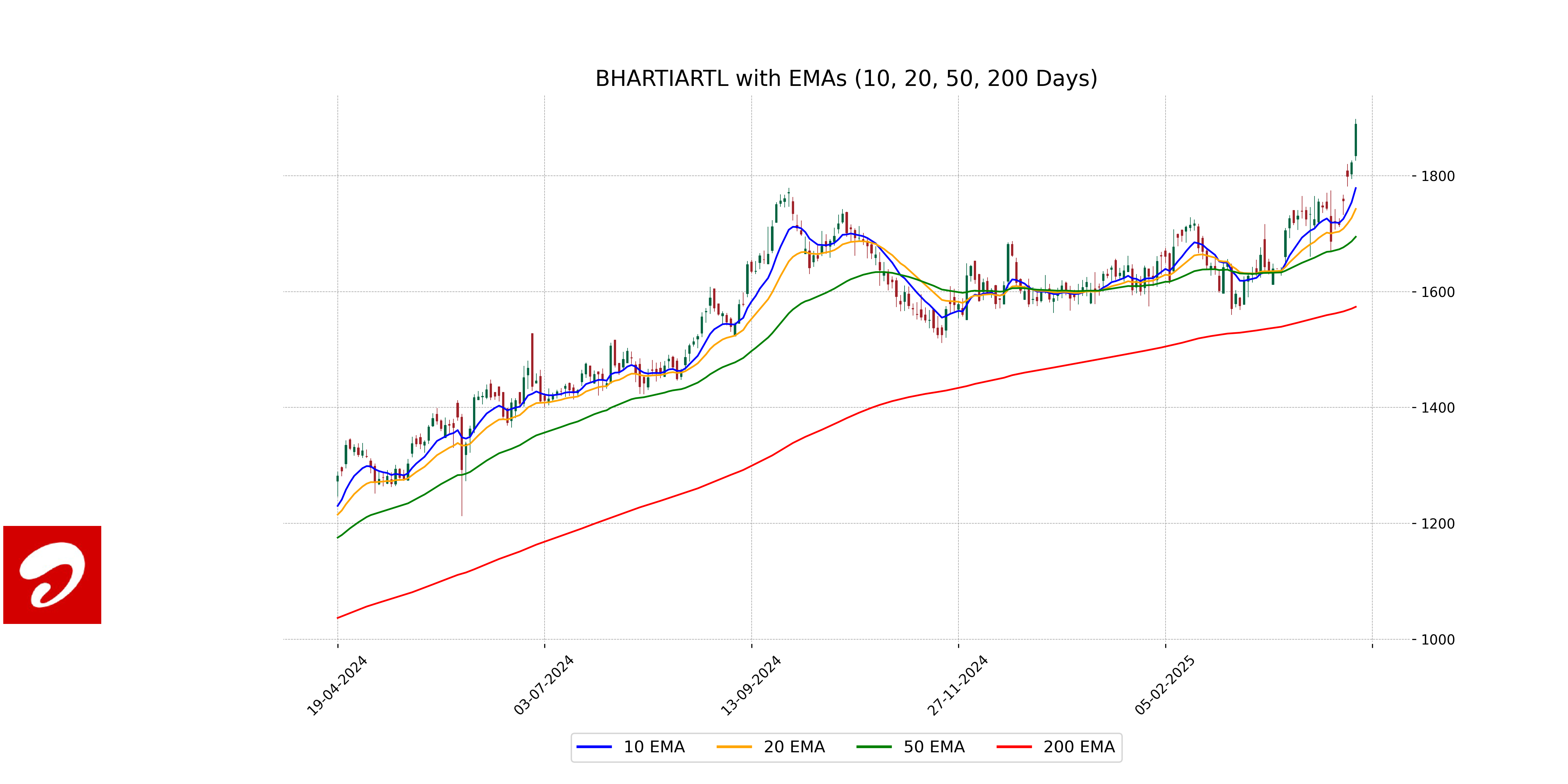 Bharti Airtel's closing price of 1889.10 is significantly above its 50 EMA (1694.56) and 200 EMA (1573.74), indicating a strong upward trend. Additionally, the price is also above the 10 EMA (1778.59) and 20 EMA (1742.59), reinforcing its bullish momentum.