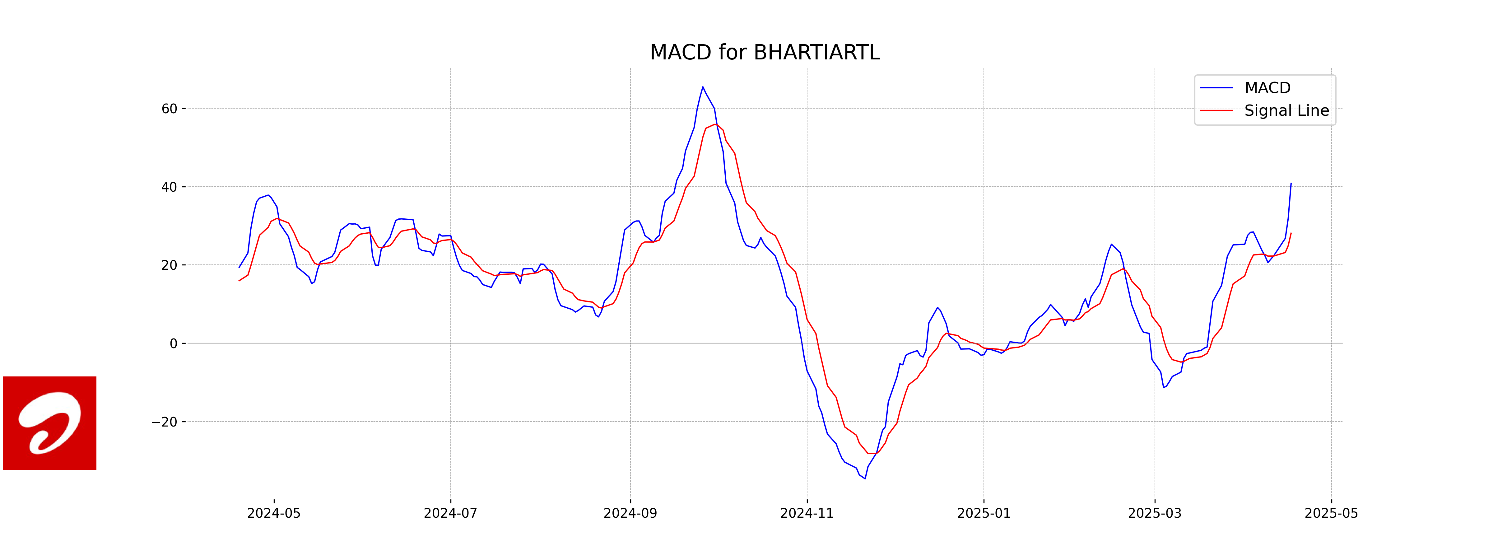 The MACD line for Bharti Airtel is at 40.80, which is above the MACD Signal line at 28.08. This suggests a bullish momentum as the stock experiences an upward trend, indicating increasing buying interest.