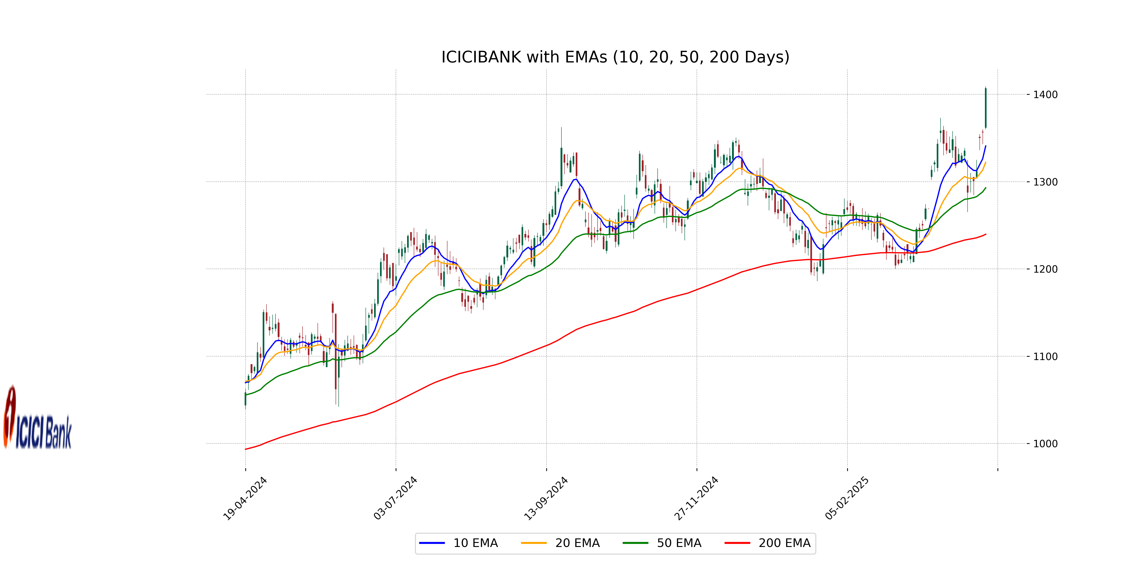 ICICI Bank's current close price of 1406.70 is above its 50-day EMA of 1292.89 and 200-day EMA of 1239.68, indicating a bullish trend. Additionally, it is also above the 10-day EMA of 1340.80 and 20-day EMA of 1322.07, suggesting strong short-term momentum.