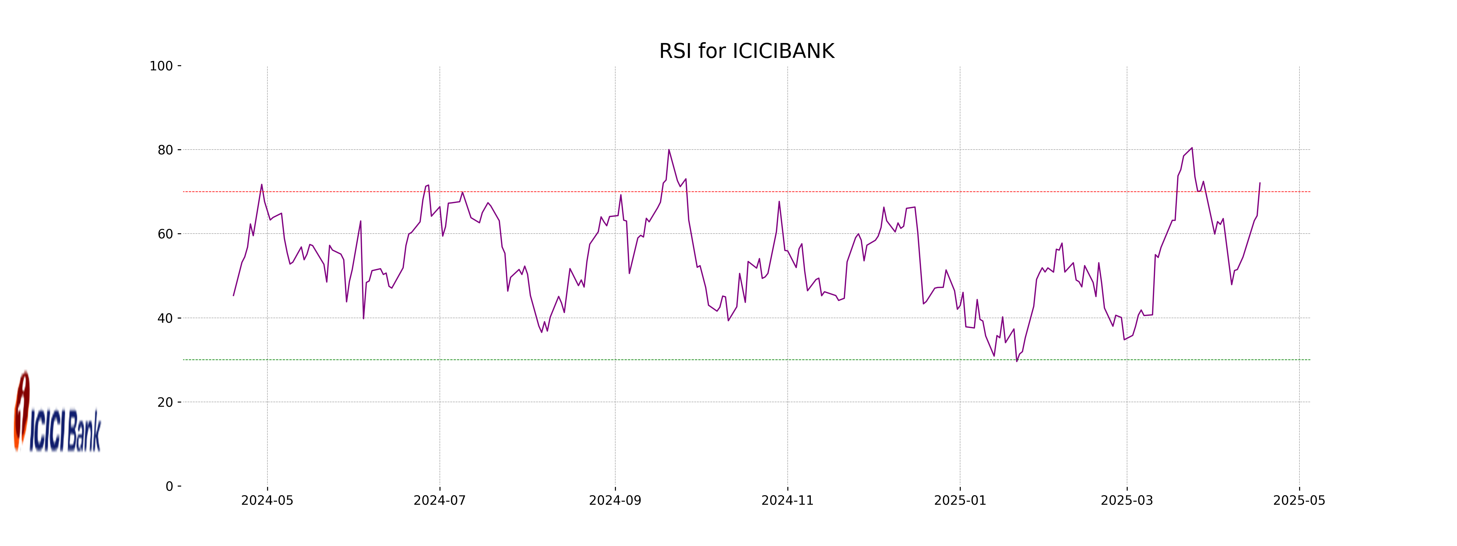 The RSI for ICICI Bank is 72.06, indicating that the stock may be entering the overbought territory. This suggests a potential for a price correction or consolidation in the near term. Investors should be cautious and consider other factors before making decisions.