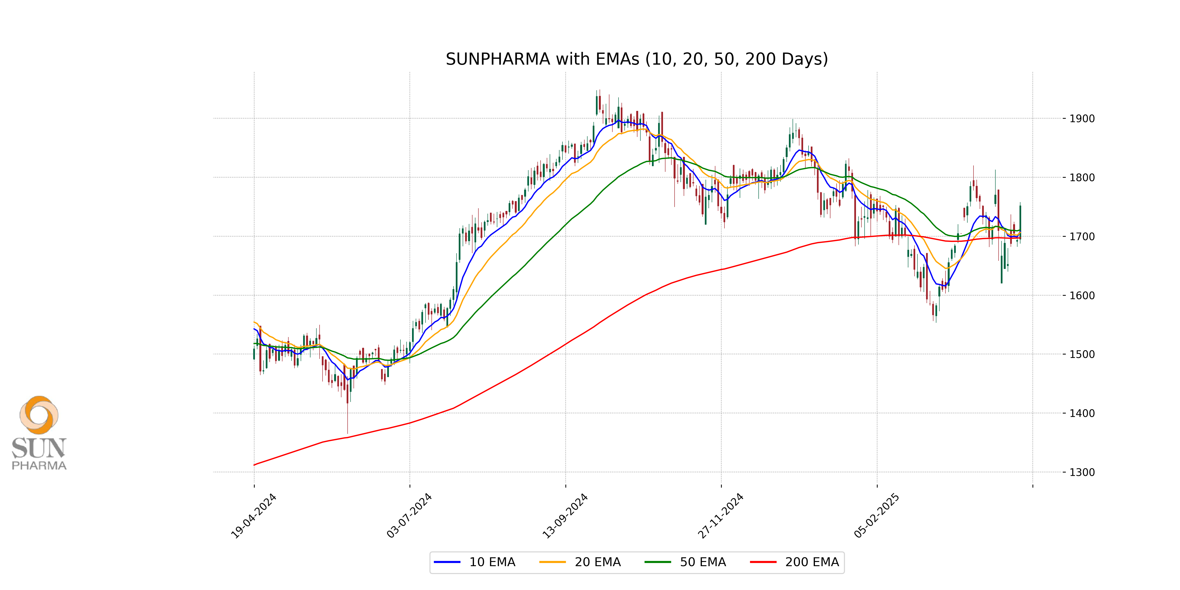 SUN Pharma's closing price of 1751.5 is above its key moving averages: 50 EMA at 1710.74, 200 EMA at 1697.06, and 10 EMA at 1708.26. This indicates a bullish trend as the stock price is performing well above its short-term, medium-term, and long-term averages.