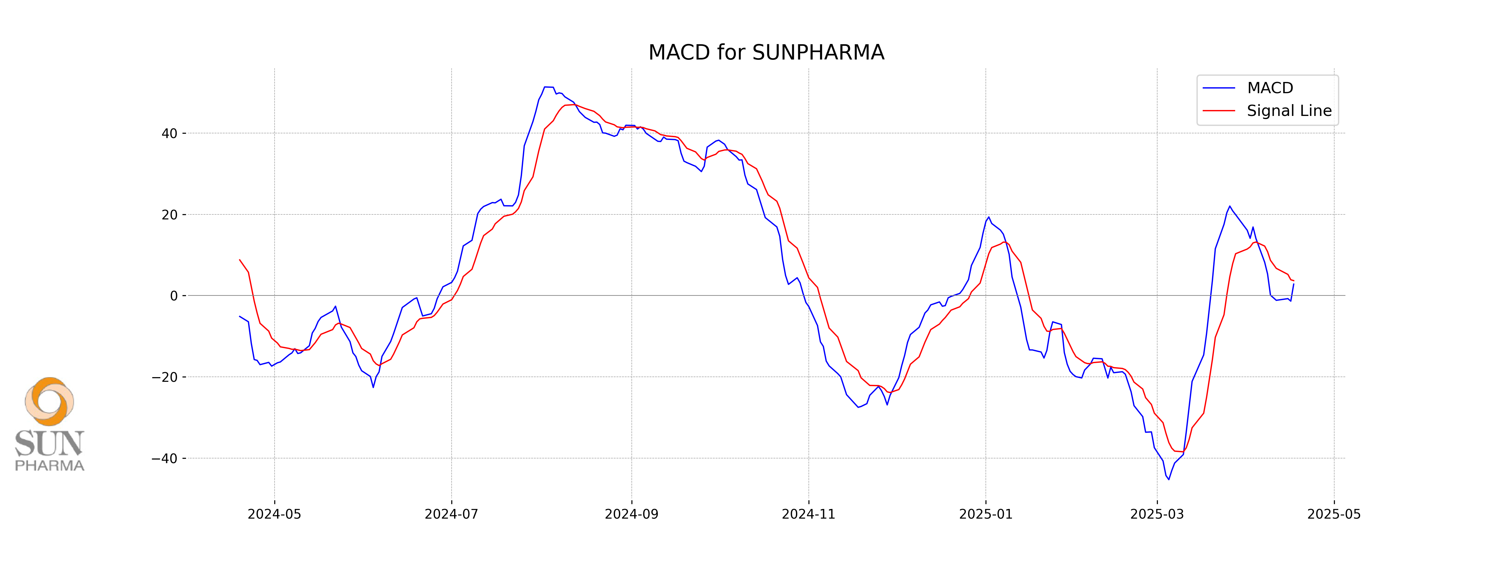 - SUN Pharma: The MACD line is at 2.81, while the signal line is slightly higher at 3.67. This configuration suggests a bearish crossover, indicating potential for short-term downward momentum unless the MACD line crosses above the signal line.