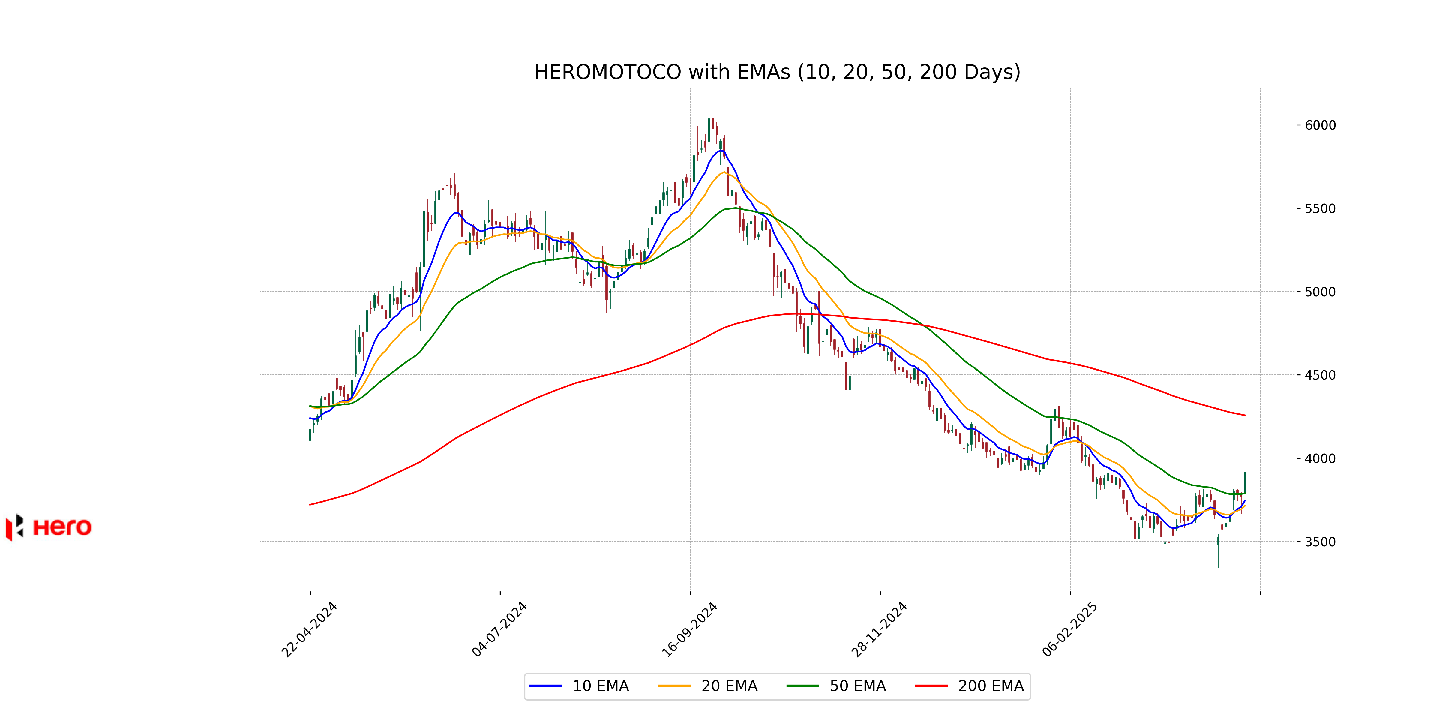 Hero MotoCorp's closing price is positioned above the 10 EMA, 20 EMA, and 50 EMA, indicating a strong short to mid-term bullish trend. However, the close remains below the 200 EMA, suggesting that the longer-term outlook might still be bearish or neutral.
