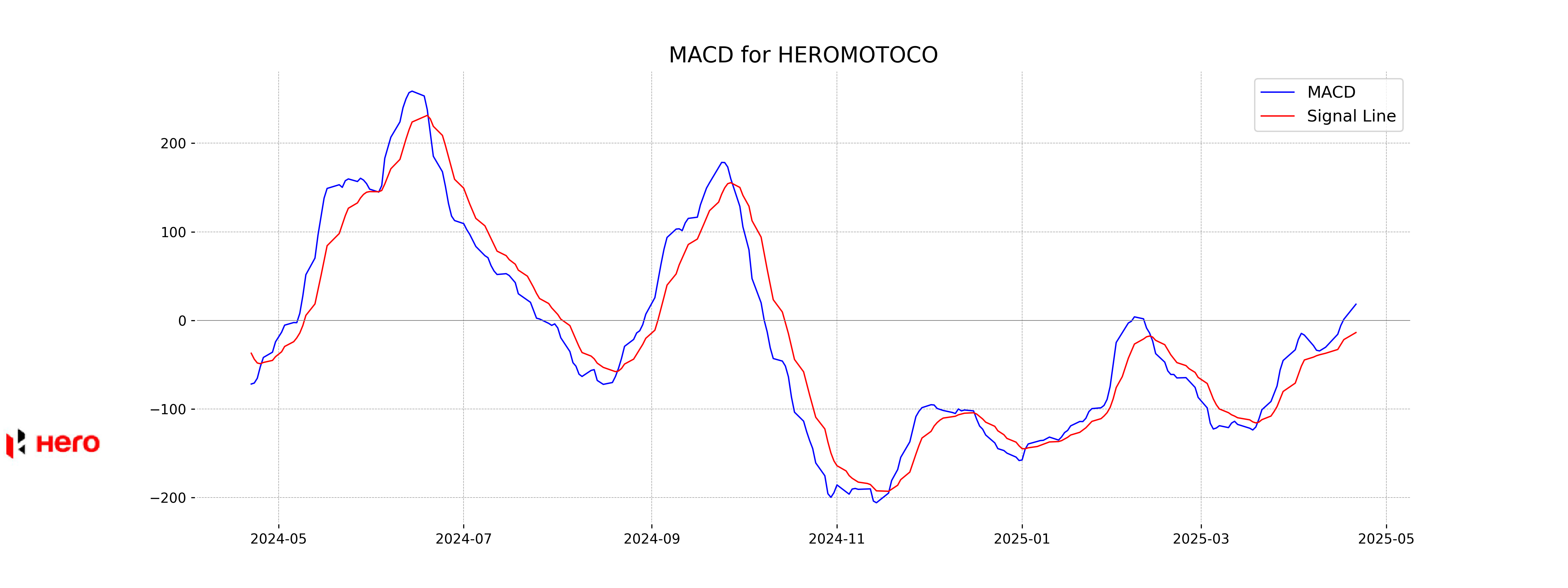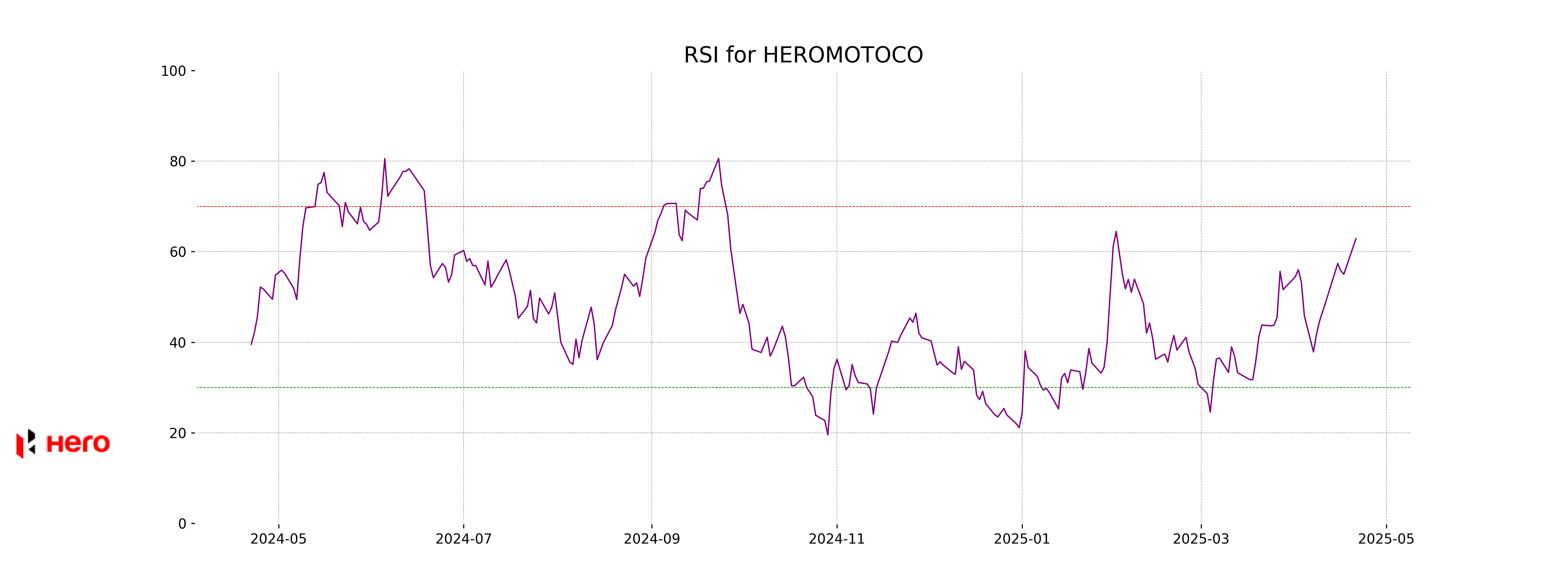 The RSI for Hero MotoCorp is 62.86, which is usually interpreted as neutral to slightly bullish. Generally, an RSI above 70 indicates that a stock is overbought, while an RSI below 30 suggests it is oversold. With an RSI near 63, Hero MotoCorp isn't in the overbought or oversold territory, suggesting balanced momentum.