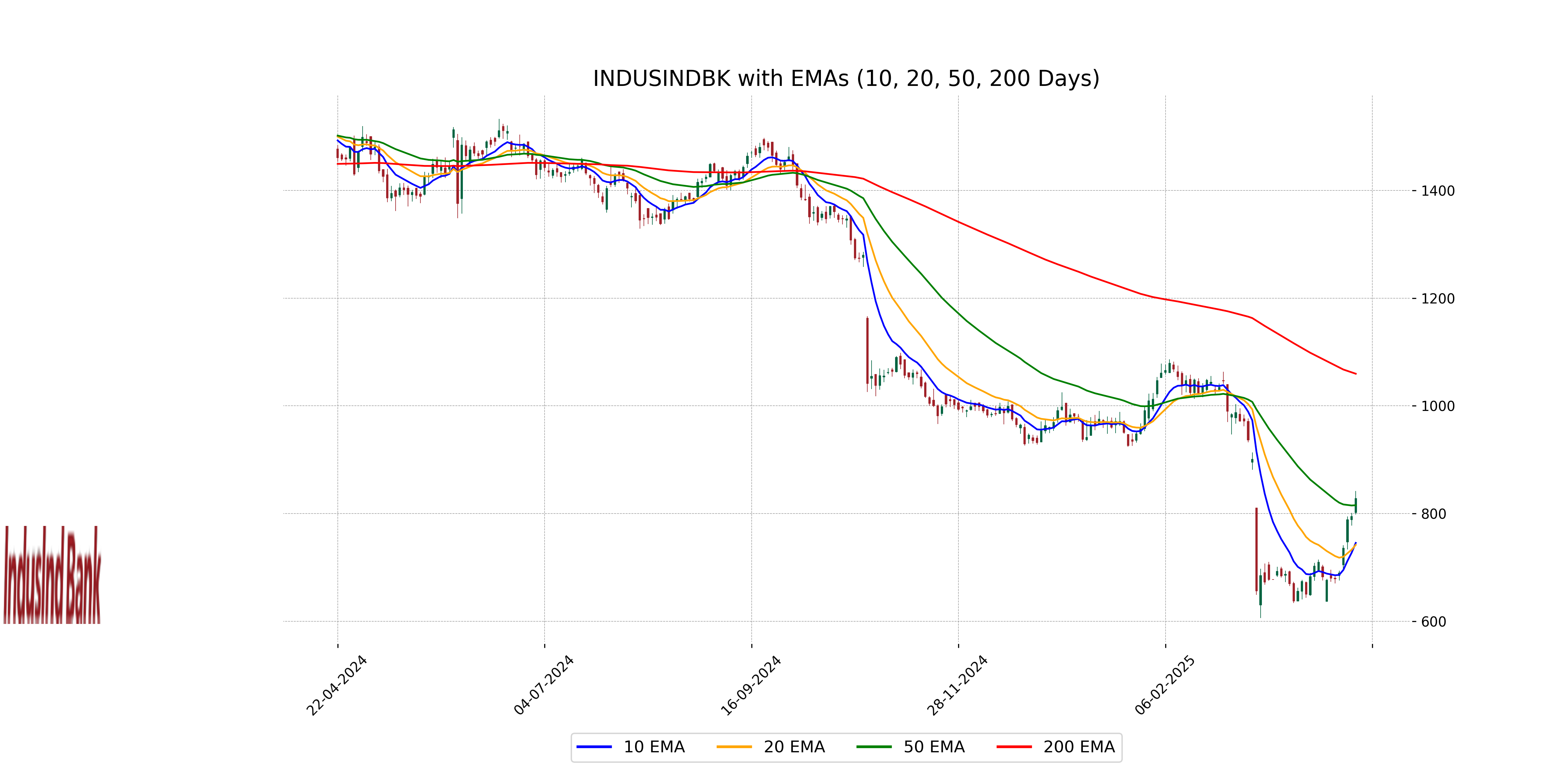 IndusInd Bank's current closing price of 828.20 is above its 10 EMA (745.46) and 20 EMA (741.80), suggesting a short-term bullish trend. However, it remains below the 50 EMA (815.44) and significantly below the 200 EMA (1059.73), indicating potential longer-term bearish pressure.