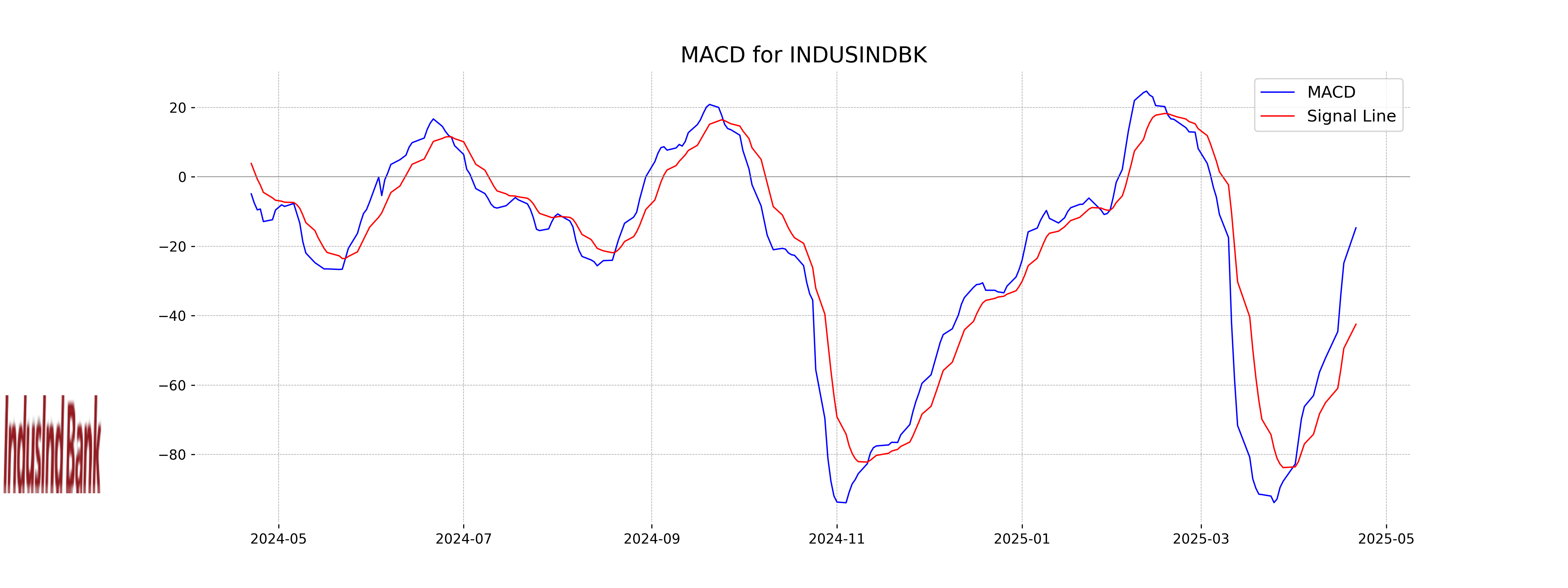 The Moving Average Convergence Divergence (MACD) for IndusInd Bank is -14.69, which is above the MACD Signal line of -42.47. This indicates a bullish signal as the MACD line is above the signal line. However, the MACD value being negative suggests that there might still be underlying bearish momentum overall.