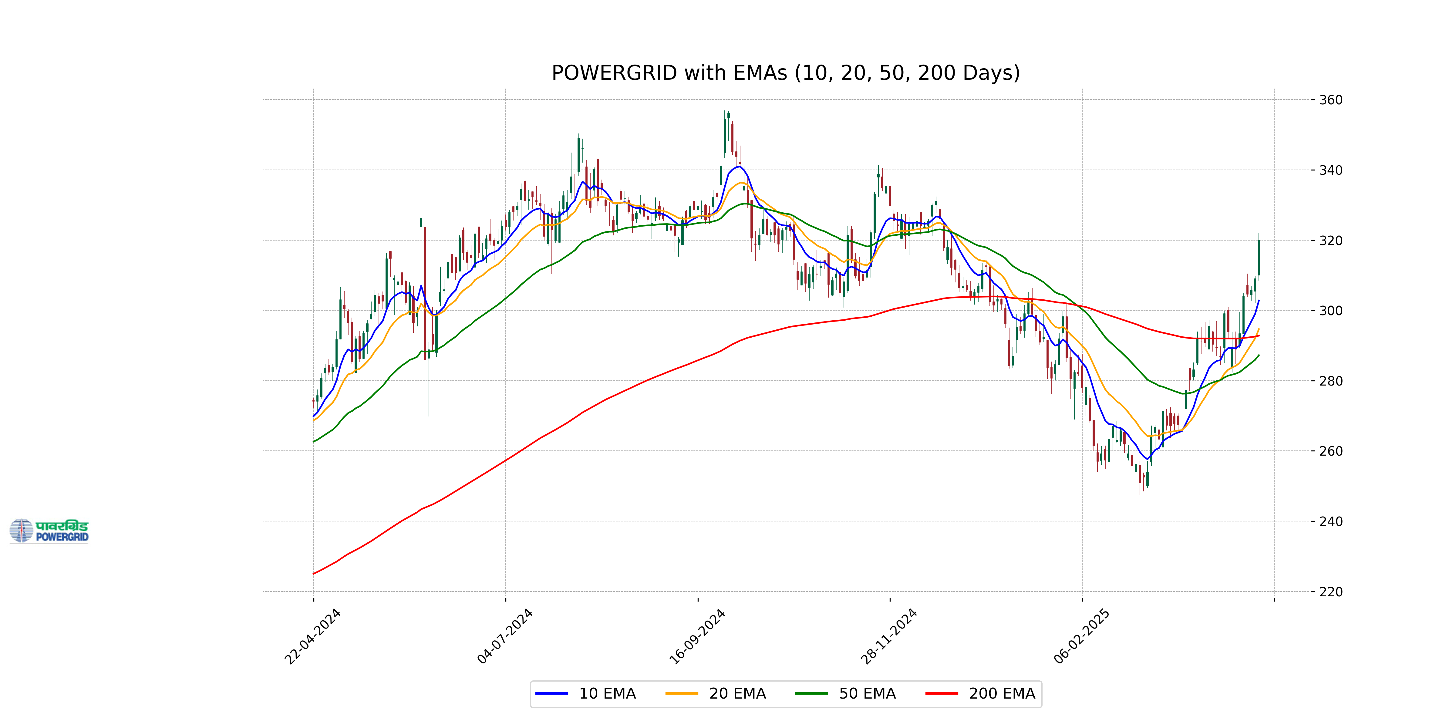 Power Grid's current stock price of 320.0 is above its 50 EMA at 287.25 and 200 EMA at 292.81, indicating a bullish trend. The price also surpasses the 10 EMA at 302.79 and the 20 EMA at 294.67, suggesting strong upward momentum.