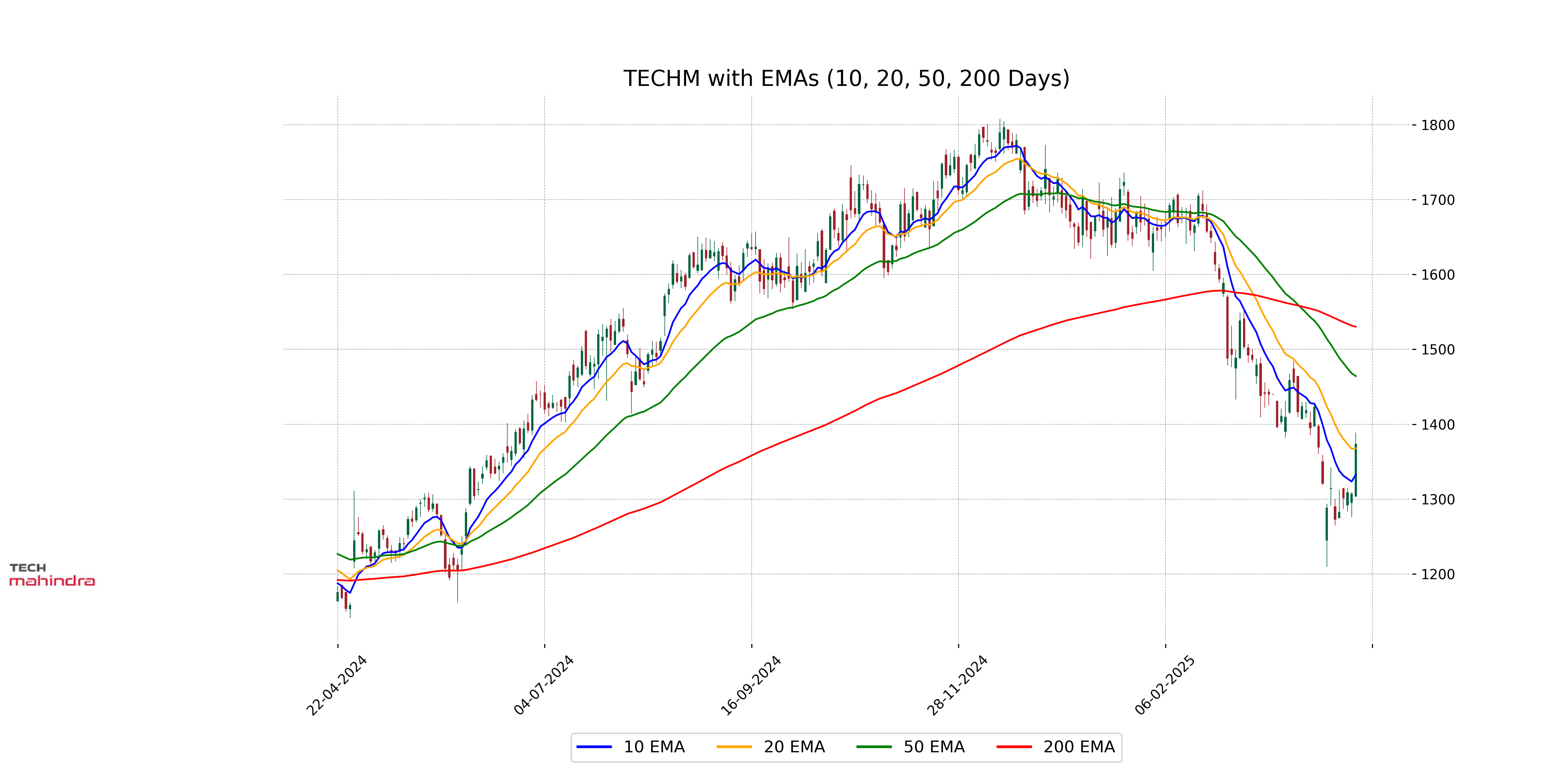 Tech Mahindra's closing price of 1373.5 is currently below both its 50-day EMA of 1464.33 and 200-day EMA of 1530.21, indicating a bearish trend in the short to medium term. However, the price is above the 10-day EMA of 1332.54, suggesting a recent upward movement.