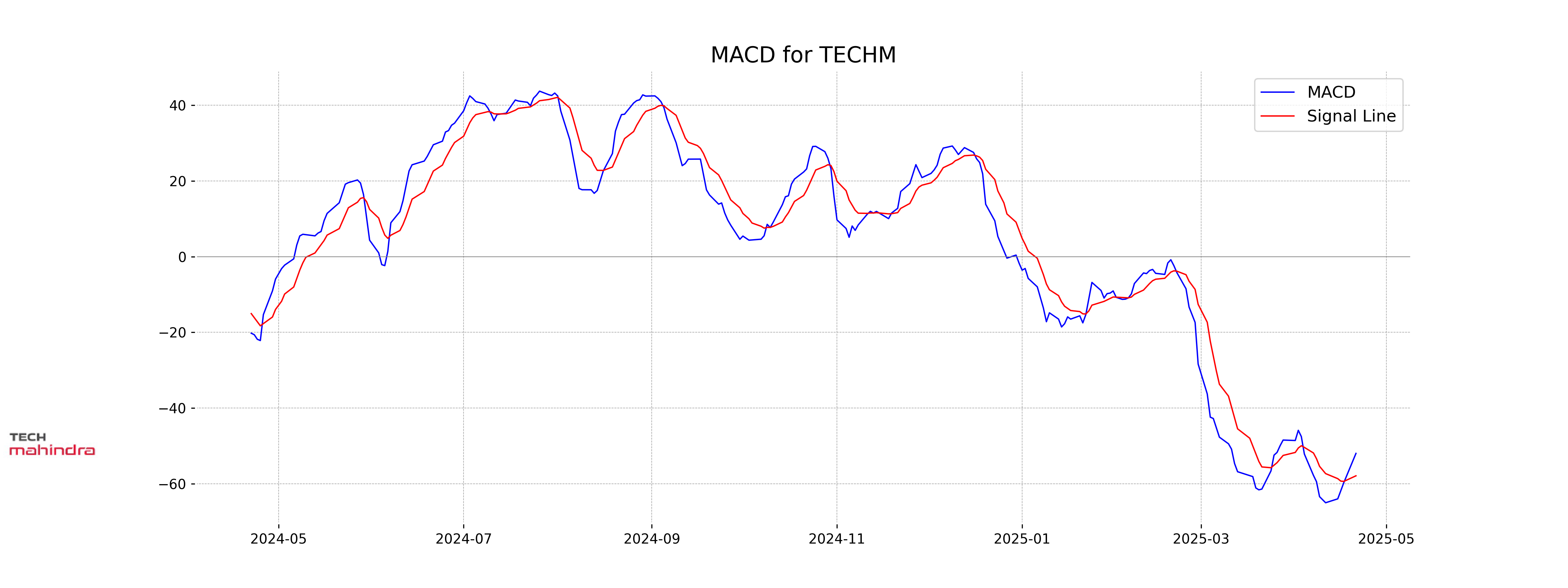 Tech Mahindra's MACD is -51.98, which is higher than the MACD Signal of -57.90. This indicates a potential bullish reversal as the MACD line is above the signal line, suggesting upward momentum in the stock price. However, these values are still in negative territory, indicating underlying bearish strength.