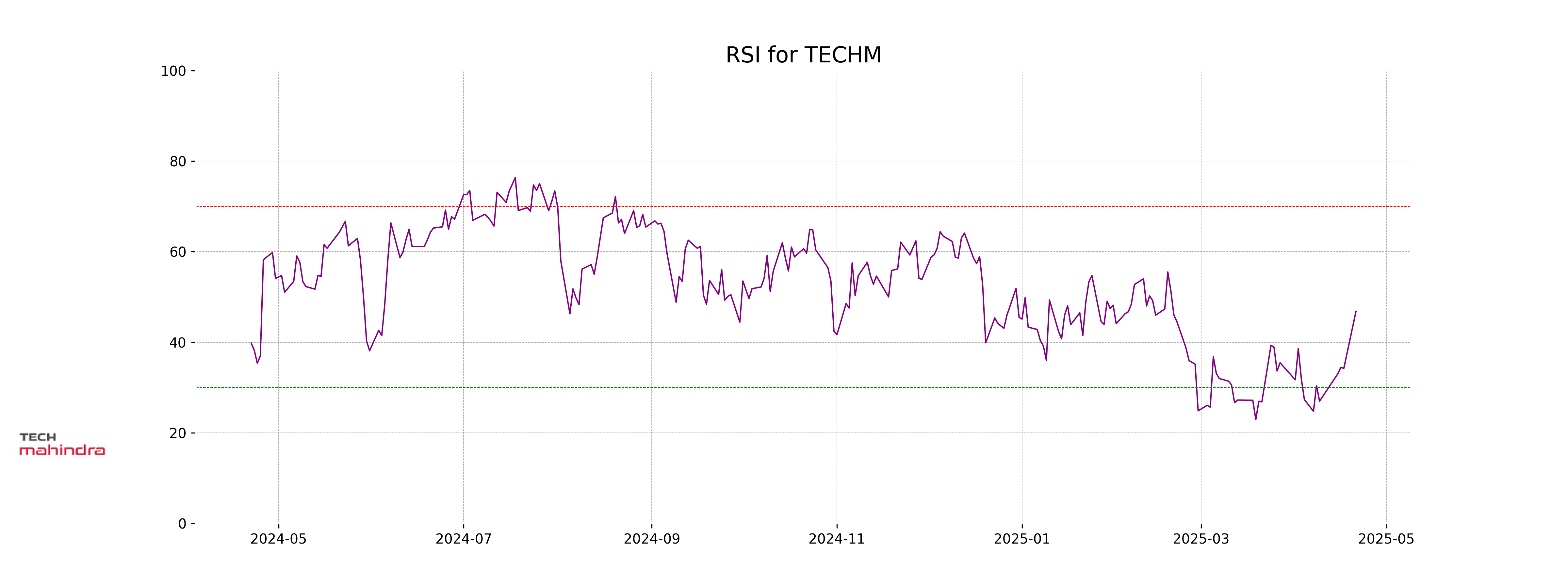Tech Mahindra's RSI is at 46.81, which is generally considered a neutral level indicating the stock is neither overbought nor oversold. This suggests that there is no strong directional momentum, either bullish or bearish, at this time.