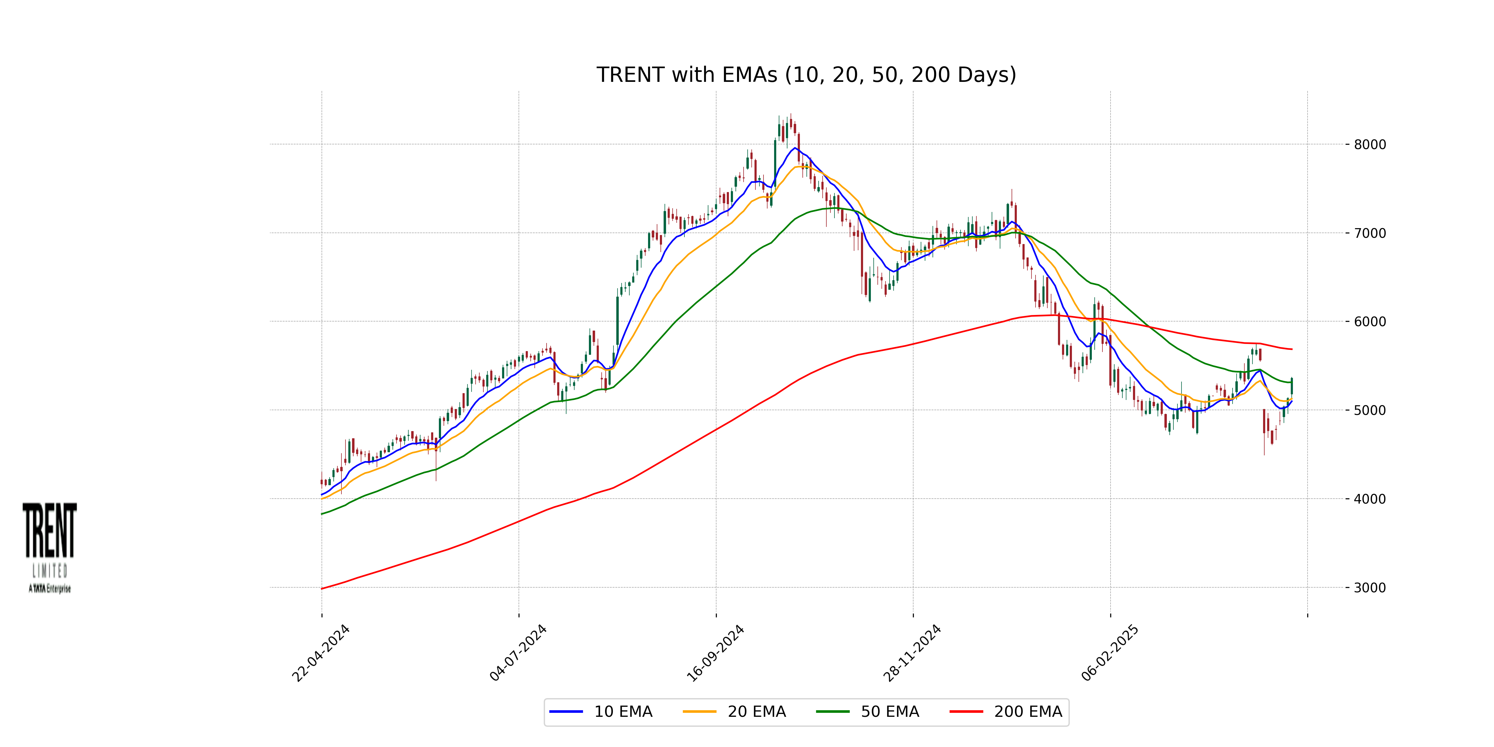 Trent Performance Summary: Trent, operating in the Consumer Cyclical sector and the Apparel Retail industry, showed a positive market performance with a closing price of 5360.0, marking a significant 4.47% increase from the previous close of 5130.5. The stock is currently trading above its 10 and 20 EMA but below the 50 and 200 EMA, indicating a short-term uptrend. The RSI of 55.48 suggests a neutral momentum. With a market cap of approximately 1.9 trillion INR and a PE Ratio of 98.57, Trent displays solid growth and investor interest.