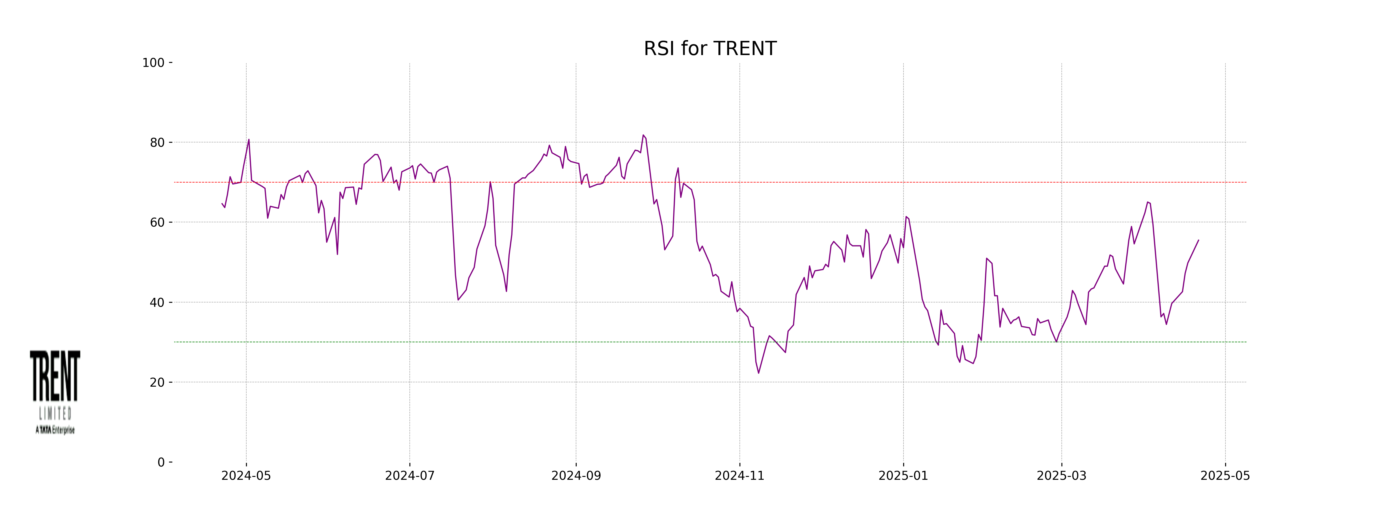 Trent's RSI is currently at 55.48, indicating a neutral trend as it is near the midpoint of the RSI scale. This suggests that the stock is neither overbought nor oversold, presenting a relatively balanced momentum at present.