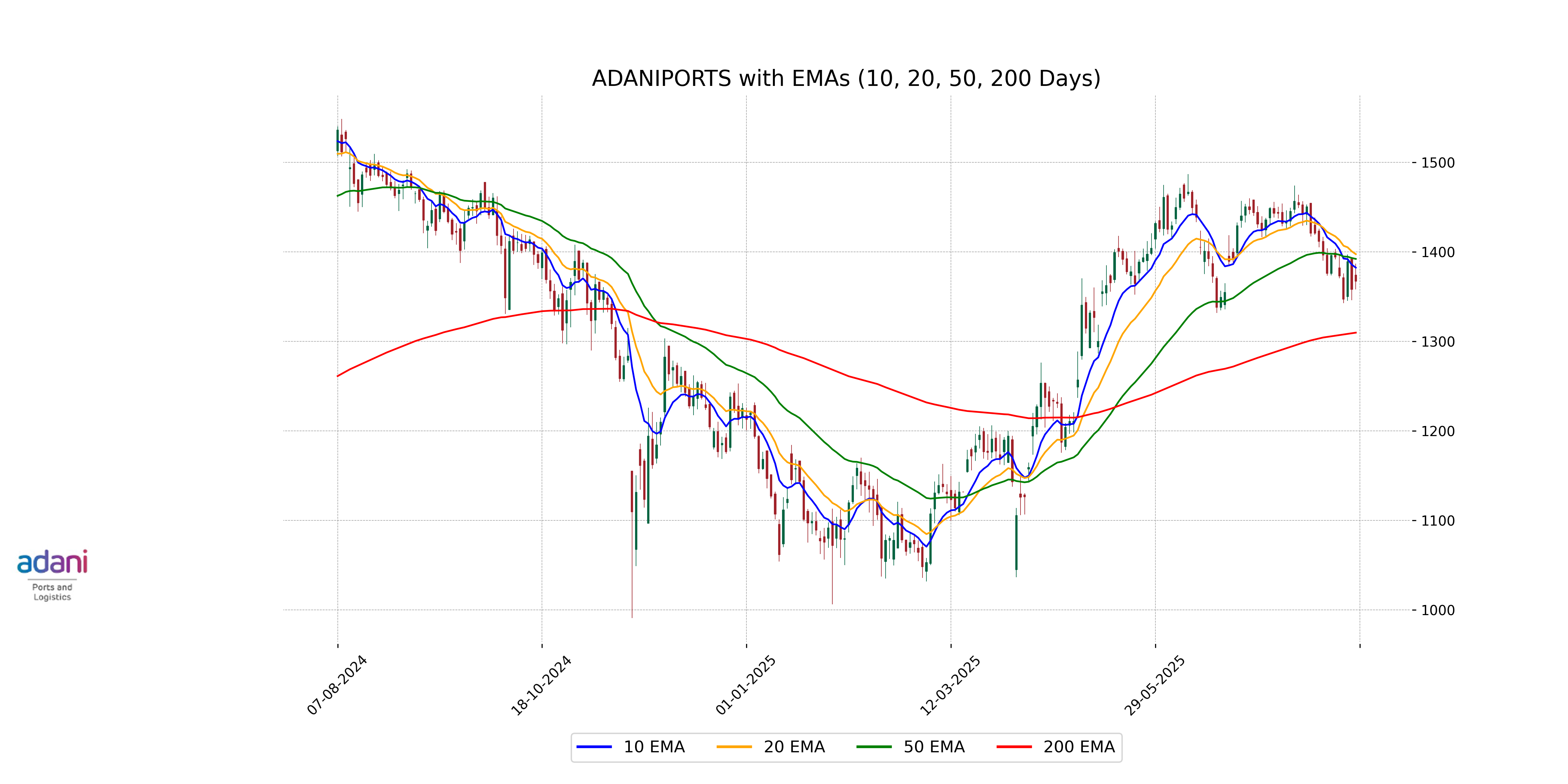 Adani Ports is currently trading below its 50-day and 20-day EMAs, with close prices at 1367.10 compared to 1392.13 and 1397.43 respectively, indicating a bearish sentiment in the short term. However, it remains above the 200-day EMA of 1309.69, suggesting a longer-term bullish trend.