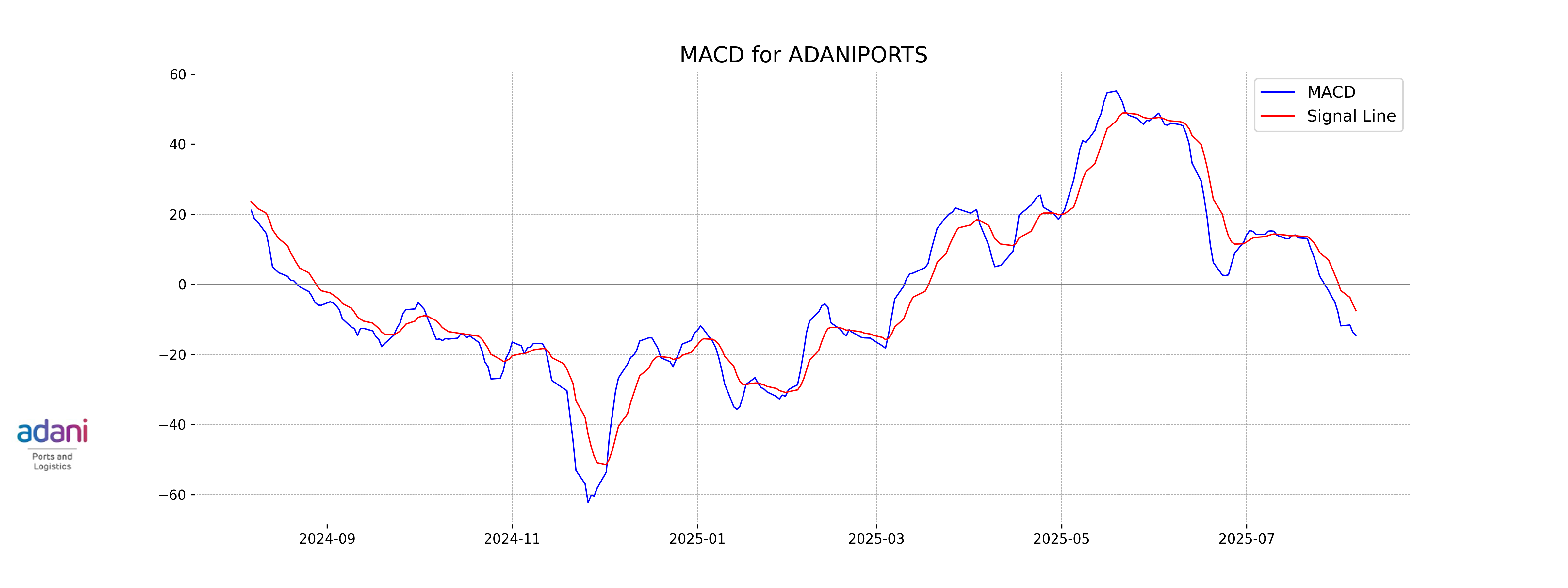 The MACD for Adani Ports is currently at -14.55, which is below the MACD Signal line at -7.50. This indicates a bearish momentum as the MACD is negative and suggests that the stock may be experiencing downward pressure.