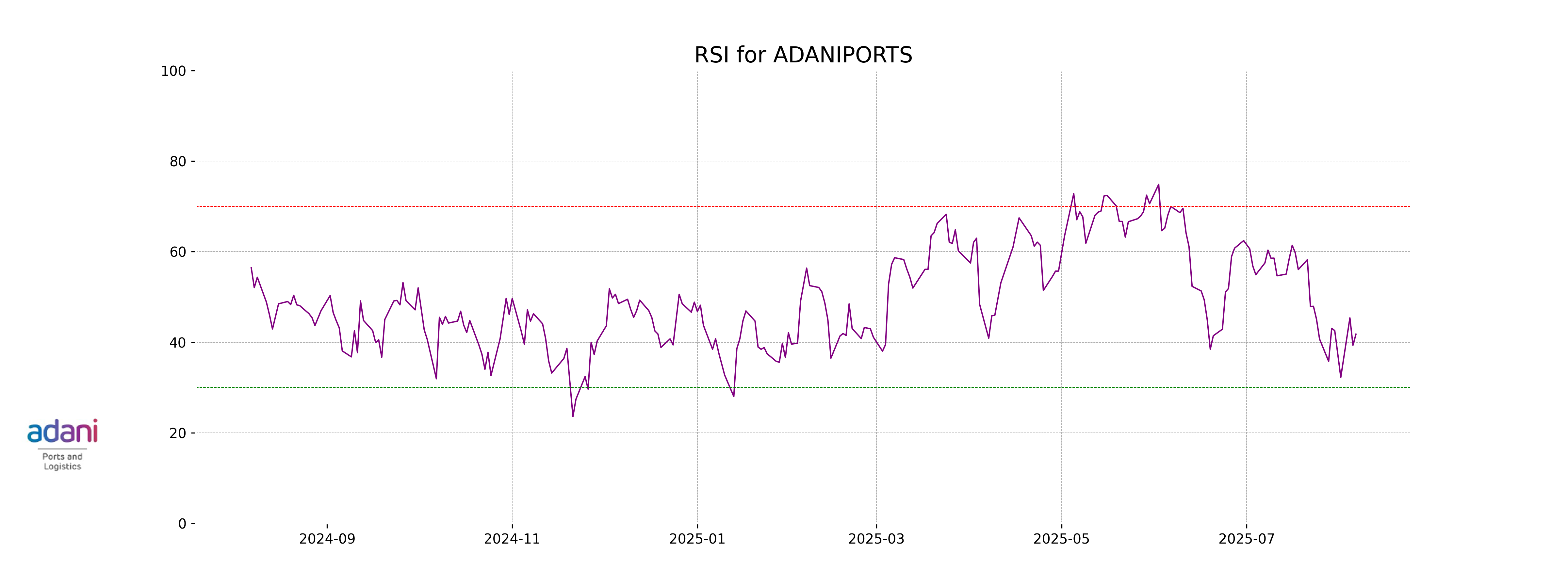 The RSI (Relative Strength Index) for Adani Ports stands at 41.77, suggesting that the stock is approaching the oversold territory but is not yet considered oversold. This level may indicate potential bullish opportunities if the indicator continues to trend downward and subsequently reverses.