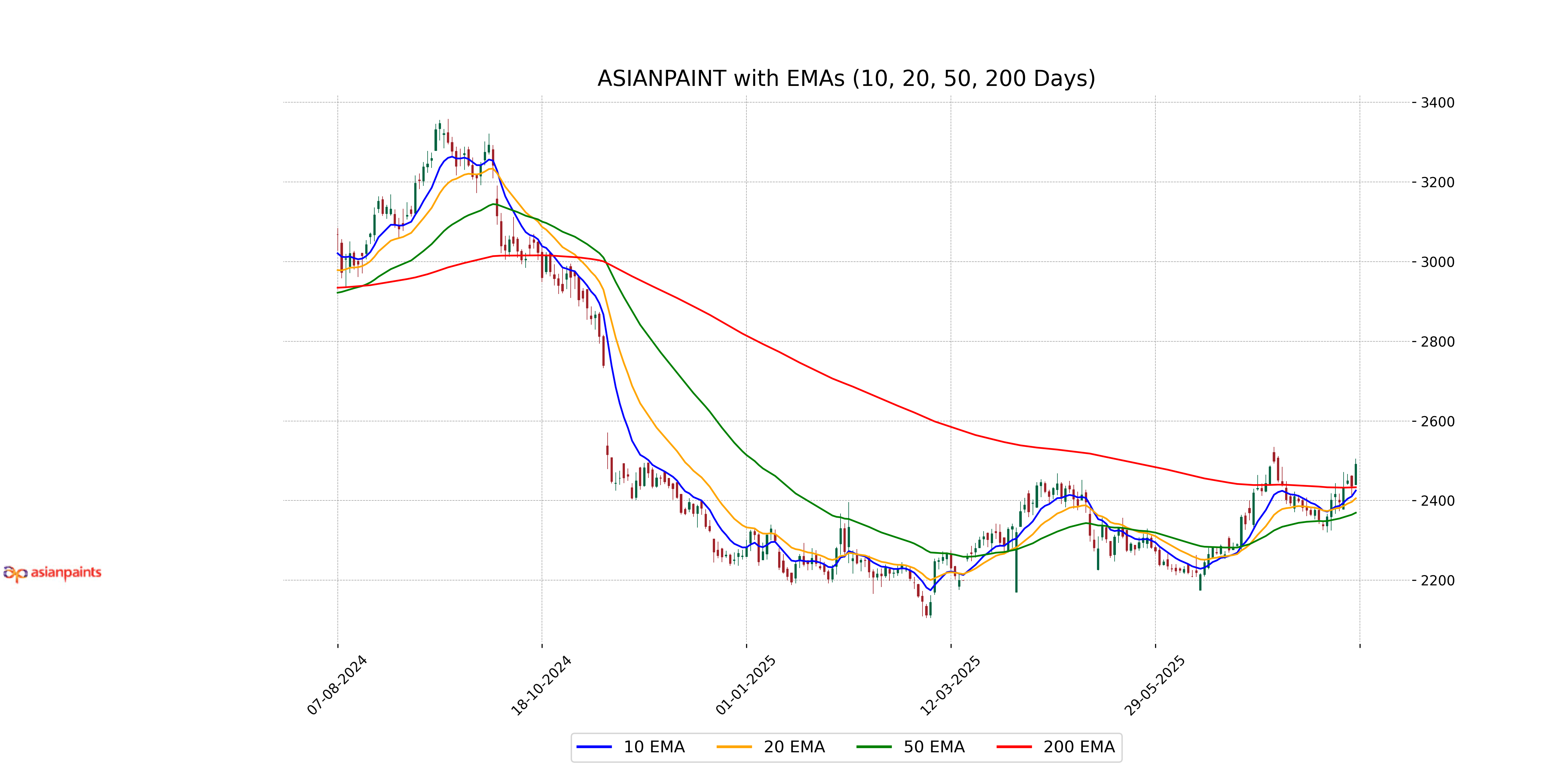 The closing price of Asian Paints is above its 10-day, 20-day, 50-day, and 200-day EMAs, indicating a bullish trend in the short to long term. Given these relationships, the stock is experiencing upward momentum relative to these key moving averages.