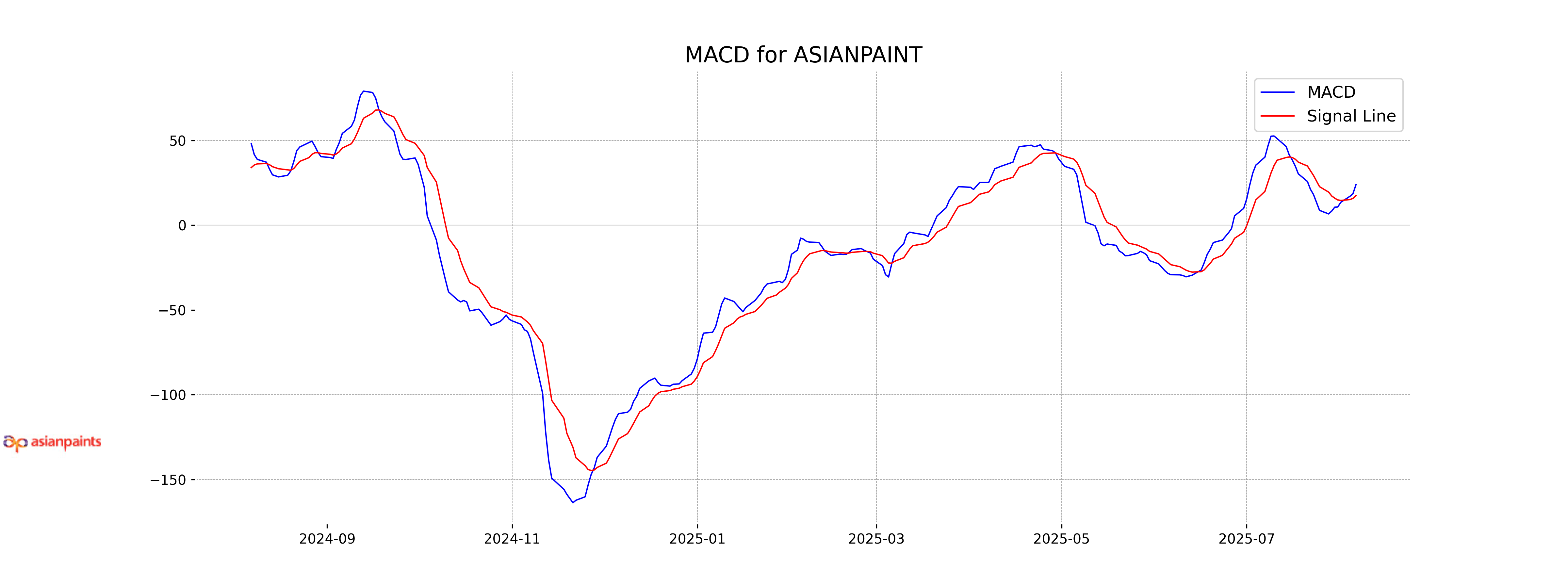 The MACD for Asian Paints is 23.83, with a MACD Signal of 17.37. Since the MACD is greater than the MACD Signal, it indicates a bullish signal, suggesting that the stock may continue to rise in the near term.