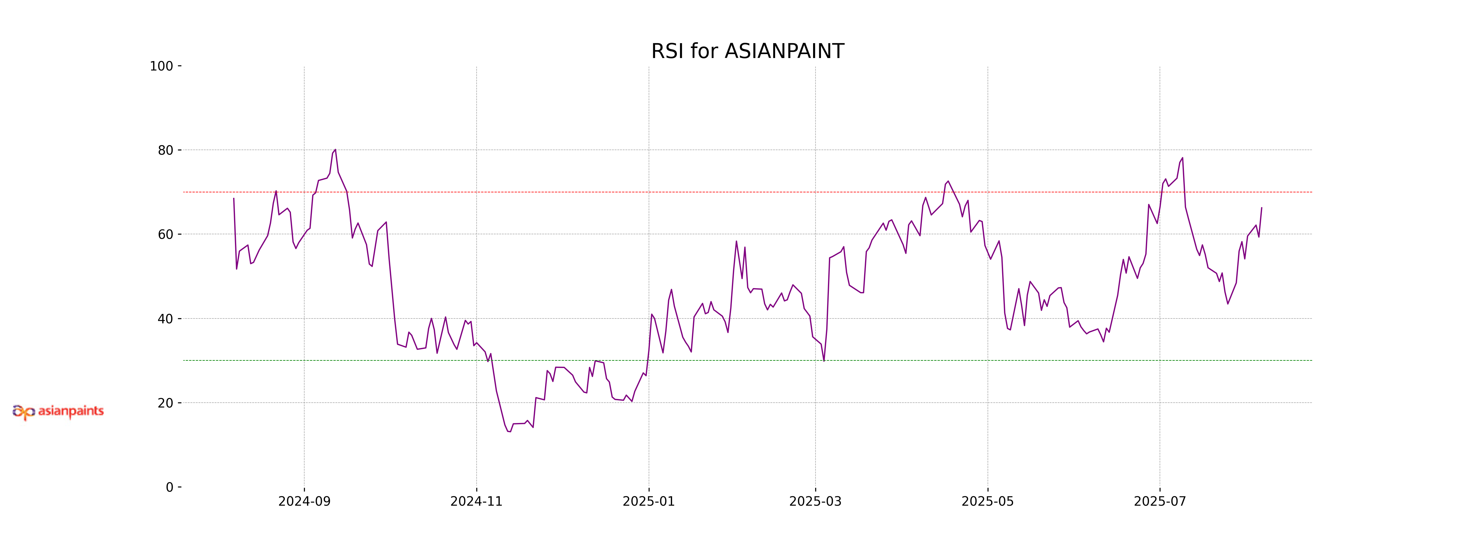 Asian Paints has an RSI of 66.25, which suggests that the stock is nearing the overbought territory. This indicates a strong upward momentum, but it also warrants caution as it approaches higher RSI levels, hinting at potential future price corrections.