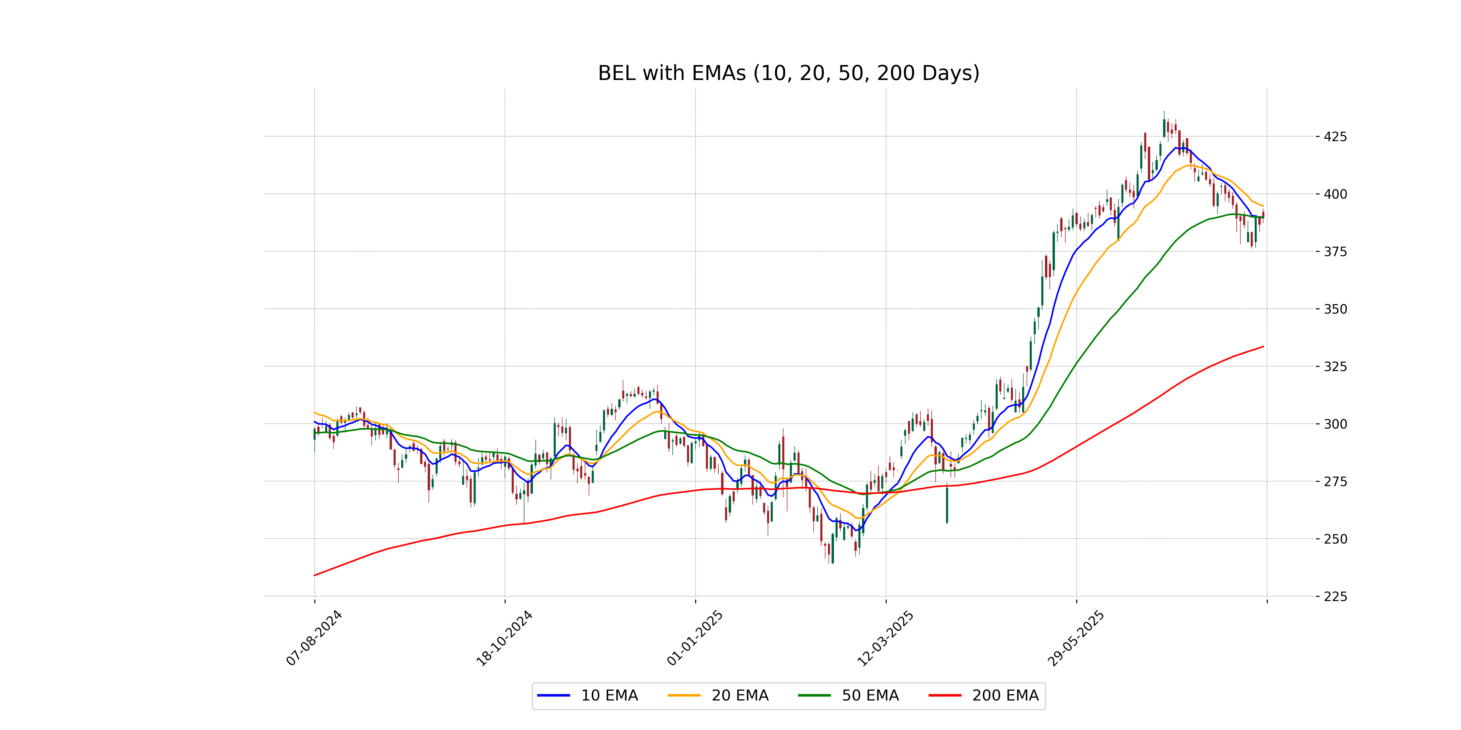Bharat Electronics is trading below its 50 EMA, slightly below at 389.700 compared to a 50 EMA of 389.776. The stock is also trading well above its 200 EMA of 333.526, suggesting a longer-term uptrend while short-term moving averages indicate possible consolidation or downward pressure.