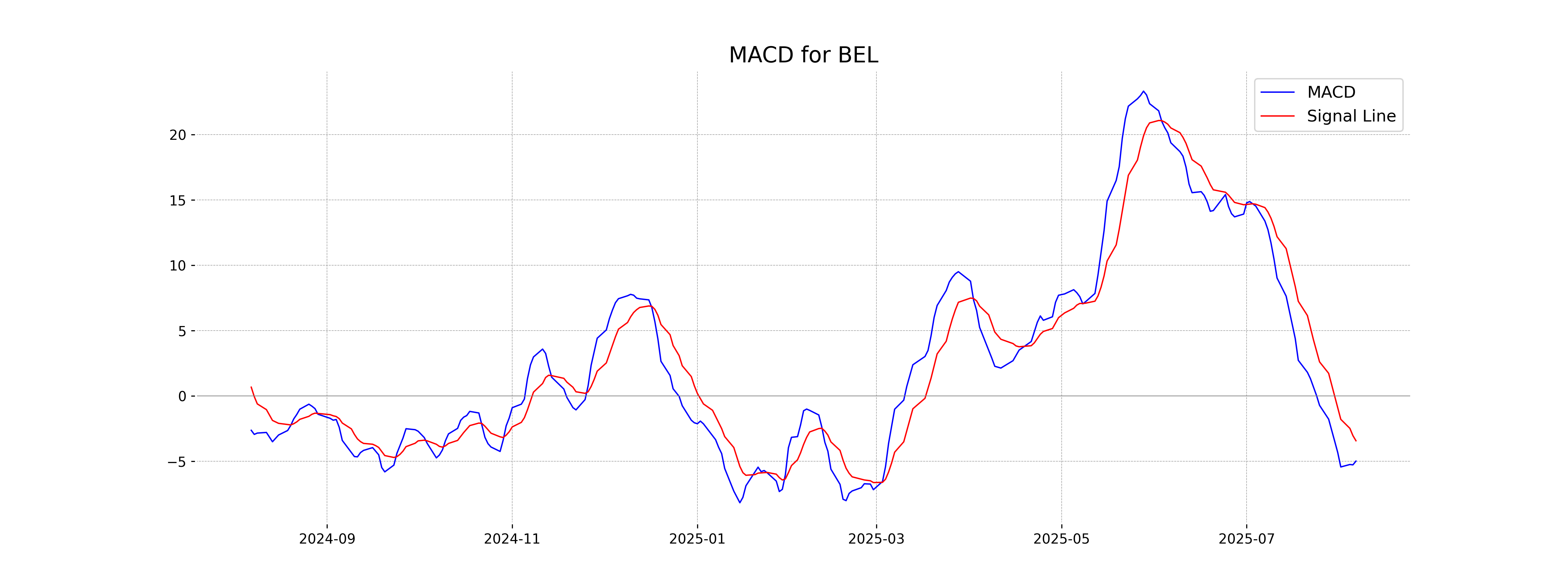 Bharat Electronics performance reflects a slight positive price movement, with a close of 389.70, indicating a 0.79% increase from the previous close. The stock's volume is substantial at 16,845,733 shares, and it operates in the Industrials sector, specifically the Aerospace & Defense industry in India. The EMA and RSI indicate short-term volatility, while the MACD suggests a bearish sentiment.