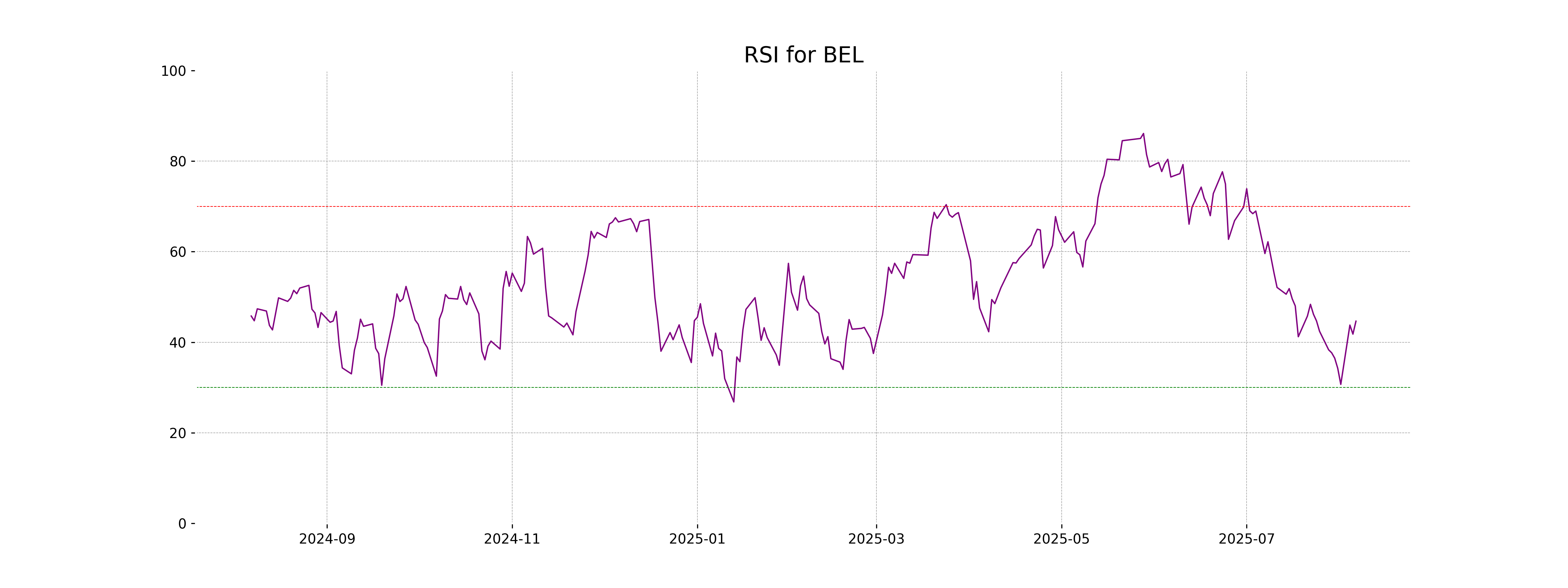 The RSI value for Bharat Electronics is approximately 44.65, indicating a neutral market condition as it is close to the midpoint of 50. This suggests that the stock is neither overbought nor oversold, implying balanced pressure from buyers and sellers.