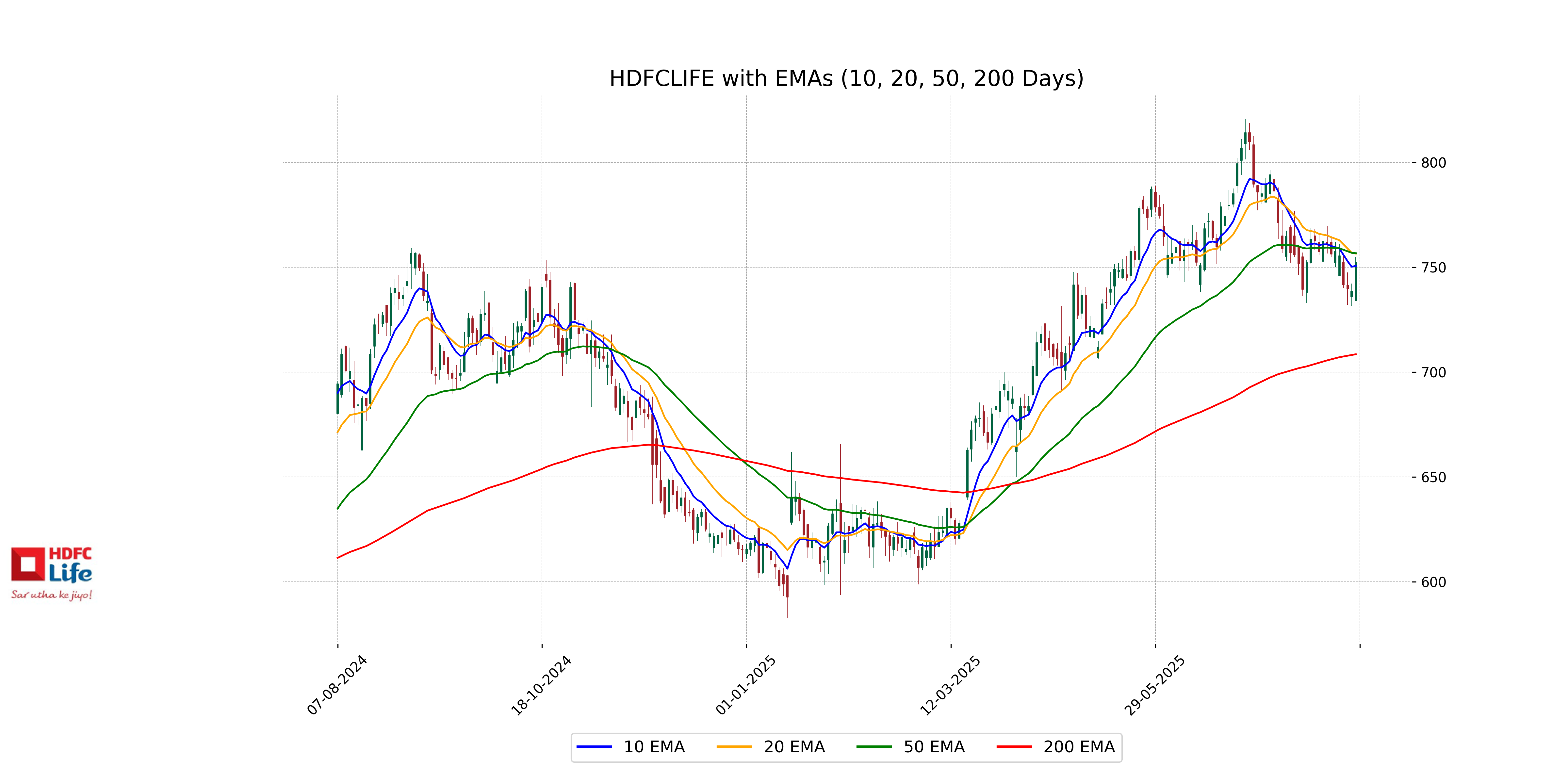 HDFC Life's closing price of 752.55 is below its 50 EMA of 756.74 and slightly below the 20 EMA of 756.53, indicating a potential bearish trend. However, it is above the 10 EMA of 750.67, suggesting short-term bullishness. The stock is well above the 200 EMA of 708.52, highlighting a strong overall position in the longer term.