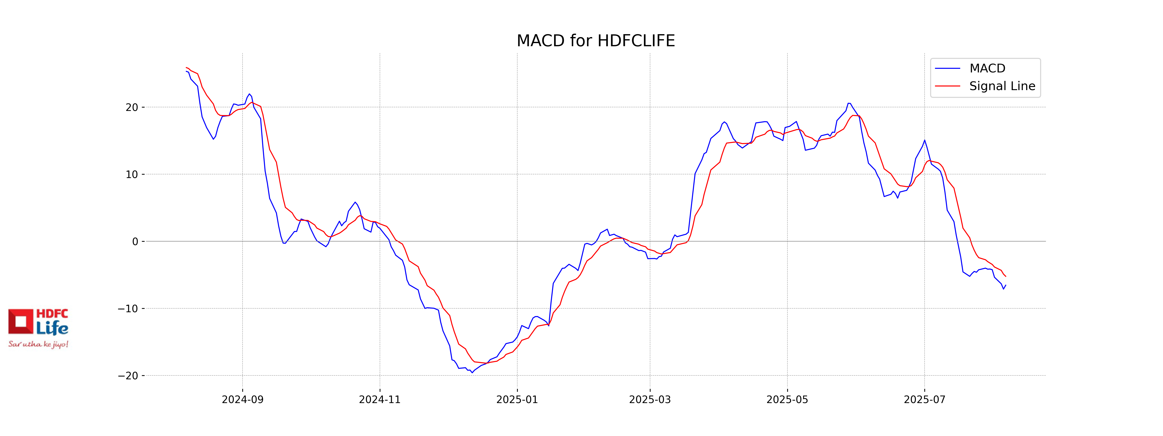 The current MACD for HDFC Life is -6.56, with a signal line of -5.23. This suggests a bearish sentiment, as the MACD line is below the signal line, indicating potential downward momentum in the stock.