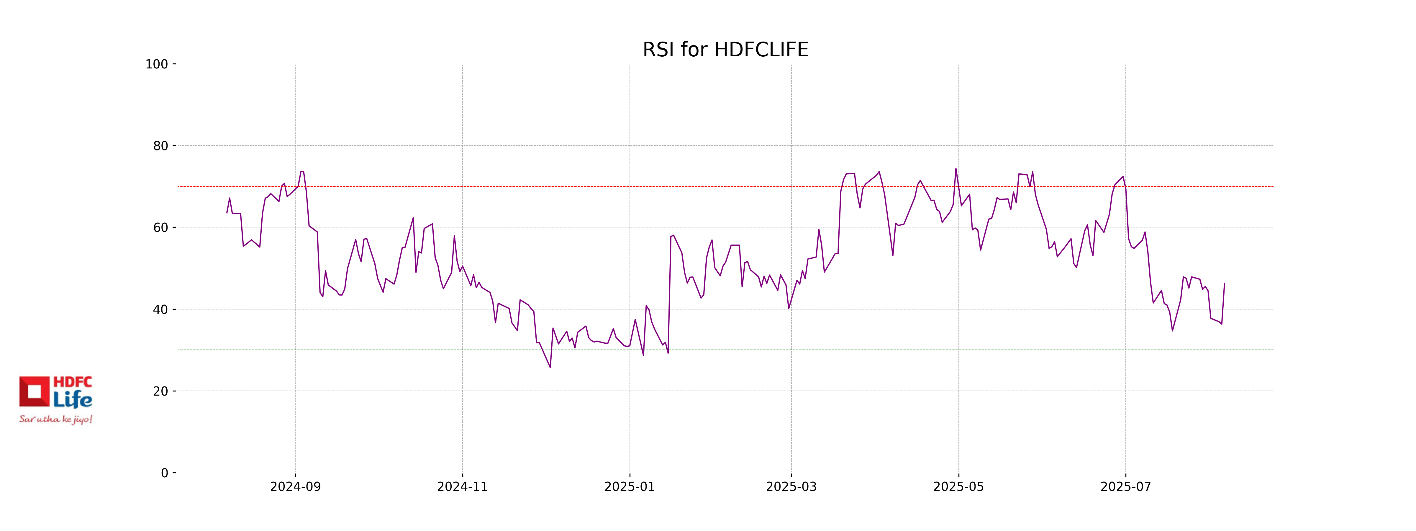RSI Analysis for HDFC Life: The RSI of 46.26 indicates that the stock is currently in a neutral zone, not in overbought or oversold territory. This suggests a balance between buying and selling pressures.