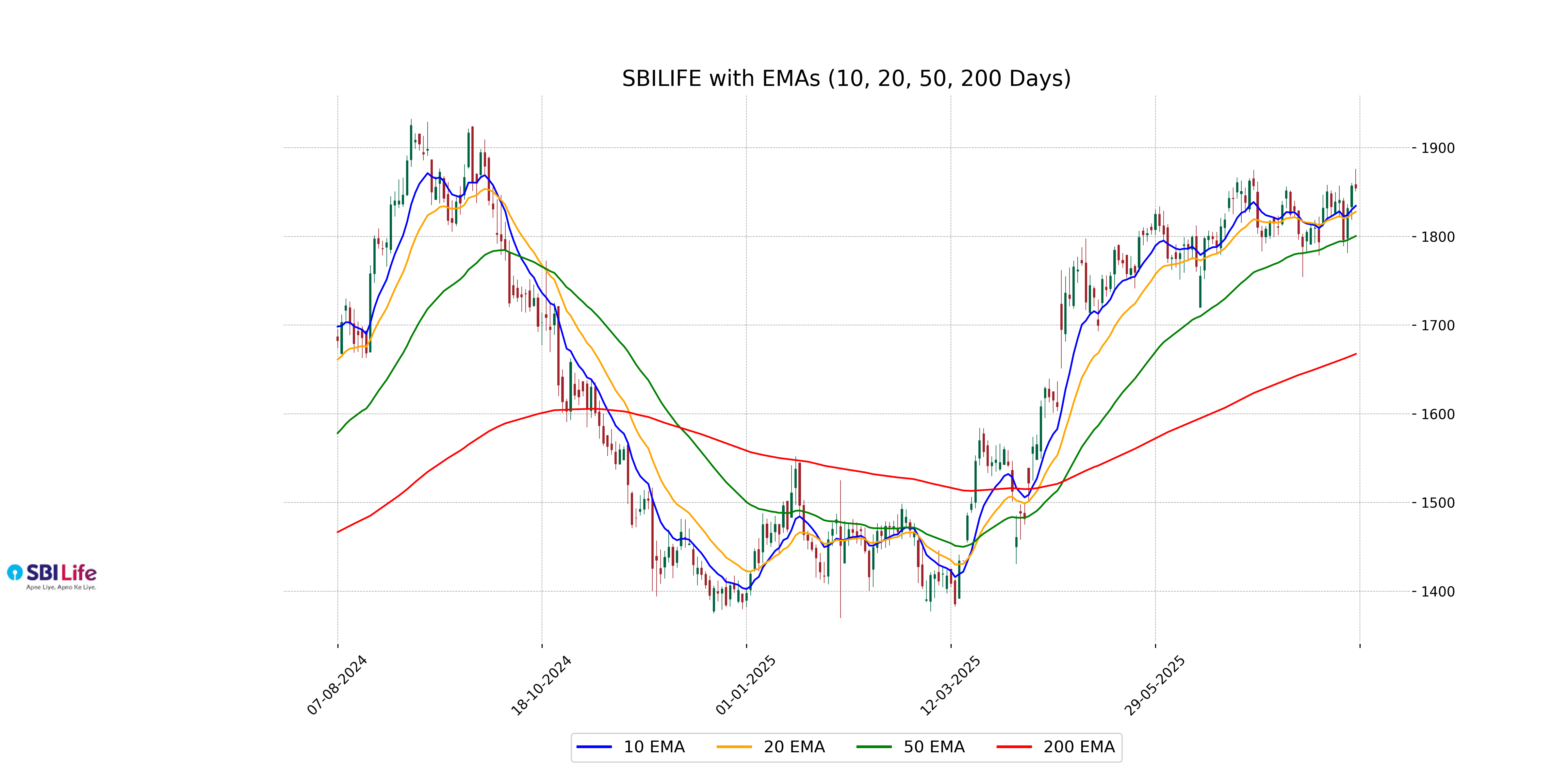 SBI Life's current closing price of 1854.30 is above both its 50-day EMA of 1800.49 and 200-day EMA of 1667.52, indicating a bullish trend over both medium and long-term periods. Additionally, the price is slightly above the 10-day EMA of 1834.50 and the 20-day EMA of 1827.73, suggesting a stronger short-term uptrend.