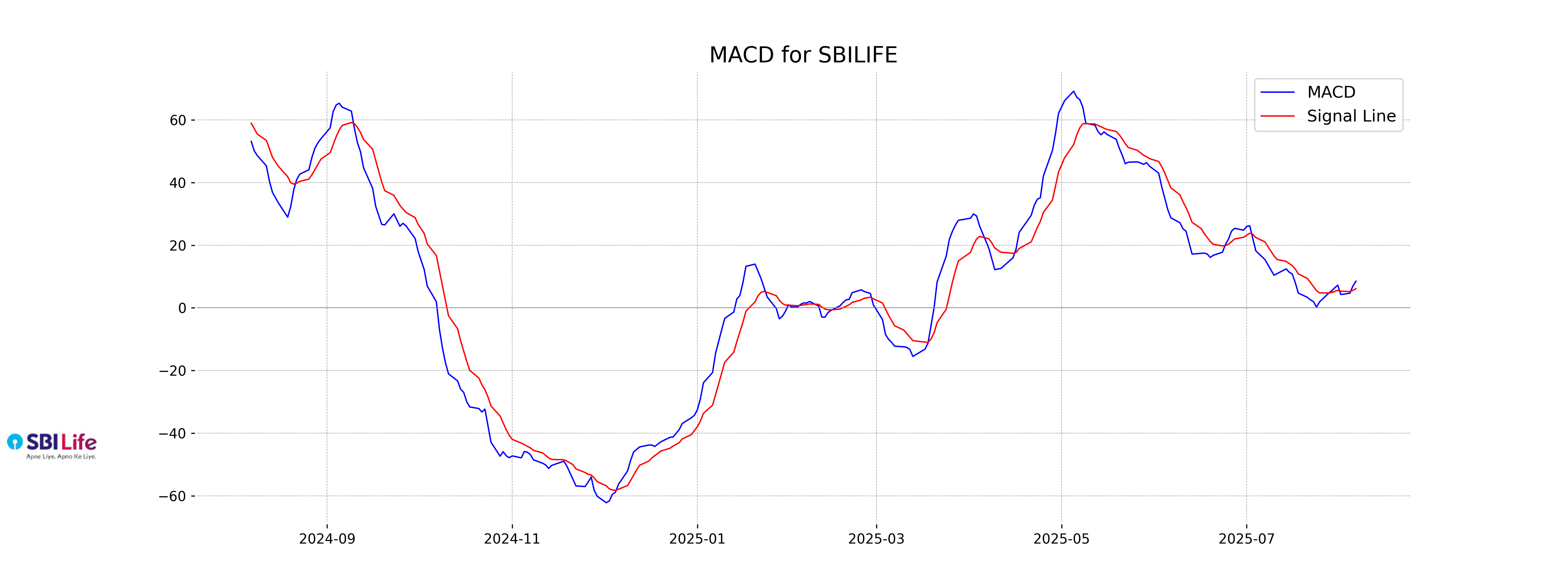 MACD Analysis for SBI Life: The MACD value is 8.51, which is above the MACD signal line at 6.15, suggesting a bullish momentum. This indicates potential upward movement in the stock price if current conditions persist.