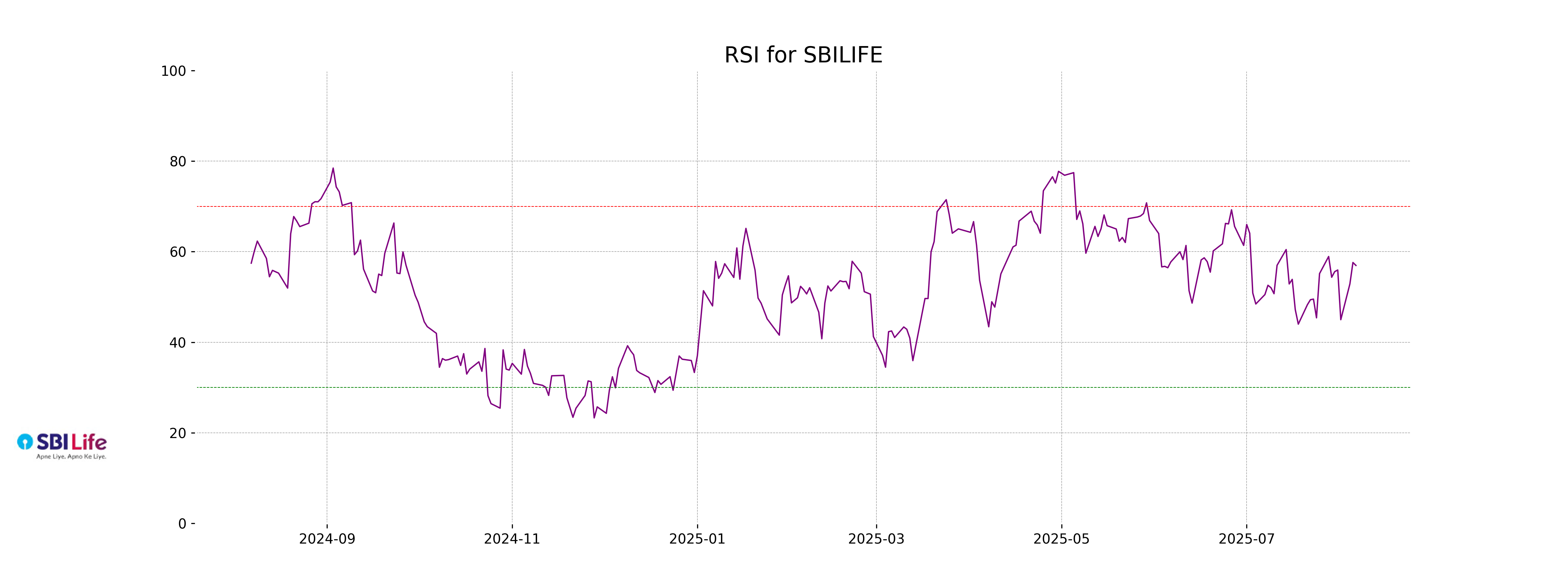 The current RSI for SBI Life is approximately 56.95, indicating a neutral market sentiment. An RSI around 50 suggests that the stock is neither overbought nor oversold, implying potential stability or consolidation in the near term.