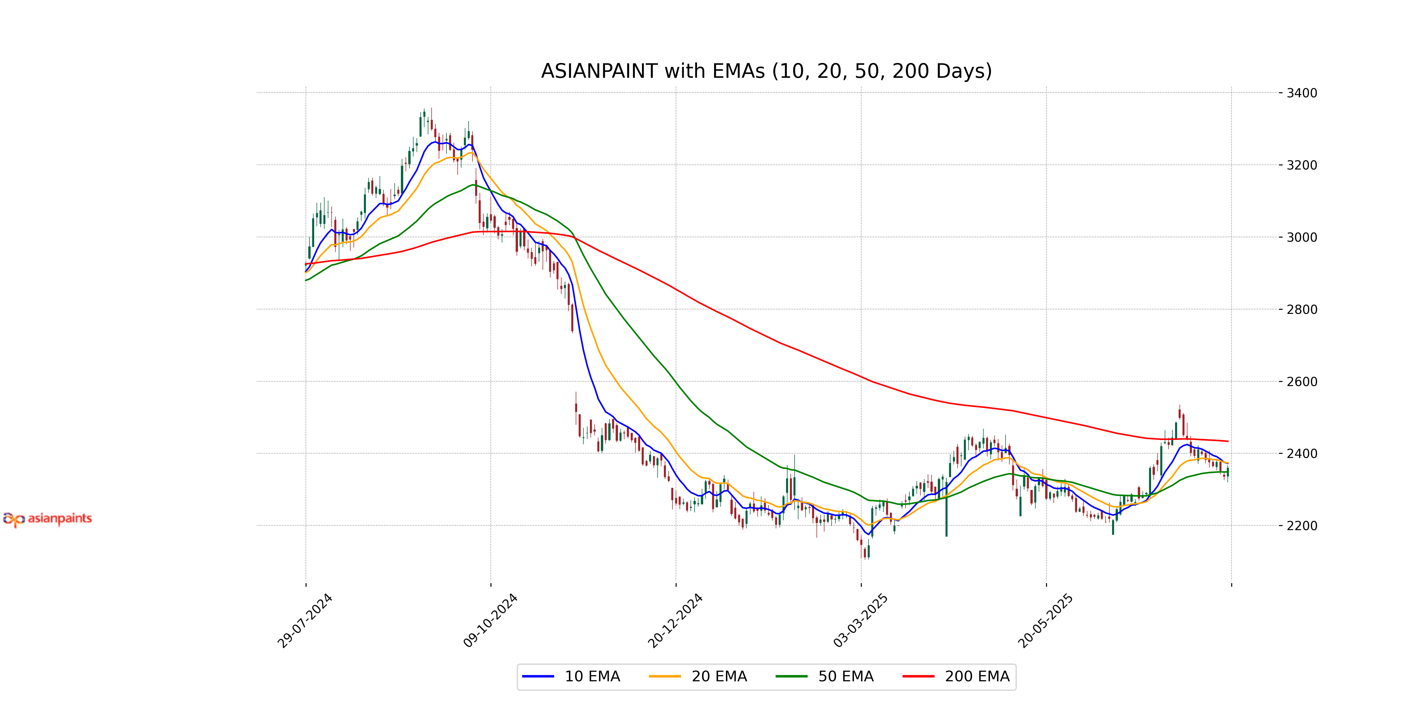 Asian Paints Performance Description: Asian Paints experienced a positive day with a closing price of 2359.60, reflecting a 1.00% increase from the previous close. Despite moving between a high of 2366.40 and a low of 2320.00, the stock's closing was above its 50-day EMA, hinting at short-term strength. However, the RSI of 48.44 implies a relatively balanced momentum, neither in oversold nor overbought territory.