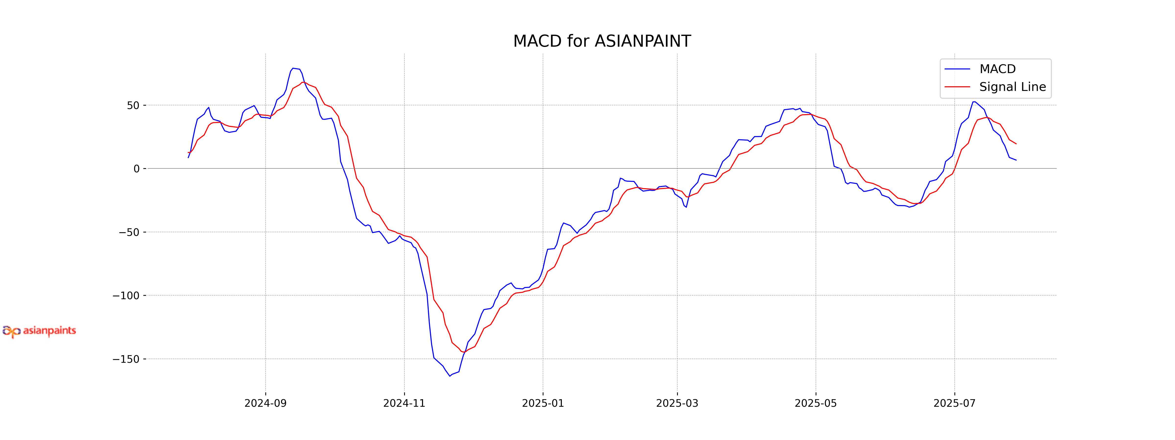 MACD Analysis for Asian Paints: The MACD value of 6.62 suggests a potential bullish signal as it moves above the signal line value of 19.47. However, monitoring for further confirmation is advised since the MACD is still relatively below the signal line.