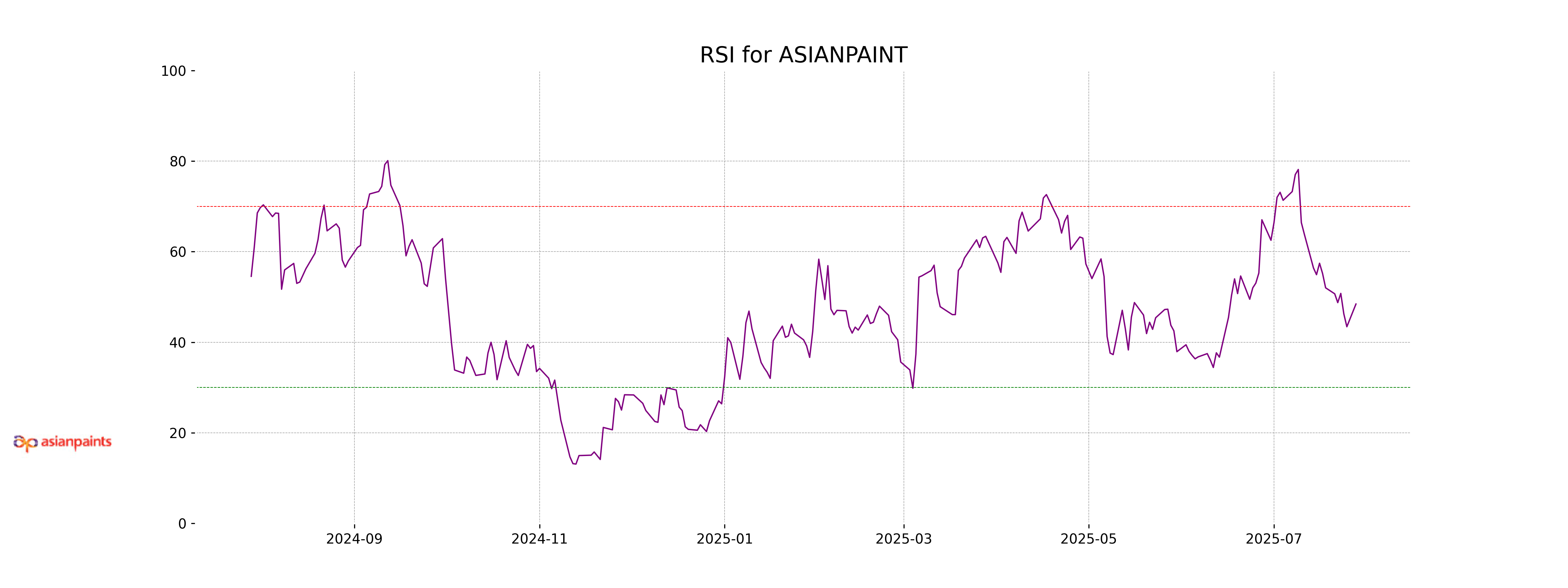 RSI Analysis for Asian Paints: The RSI of 48.44 suggests that Asian Paints is in a neutral zone, indicating neither overbought nor oversold conditions. This level implies a balance between buying and selling pressures, providing no strong directional signal.