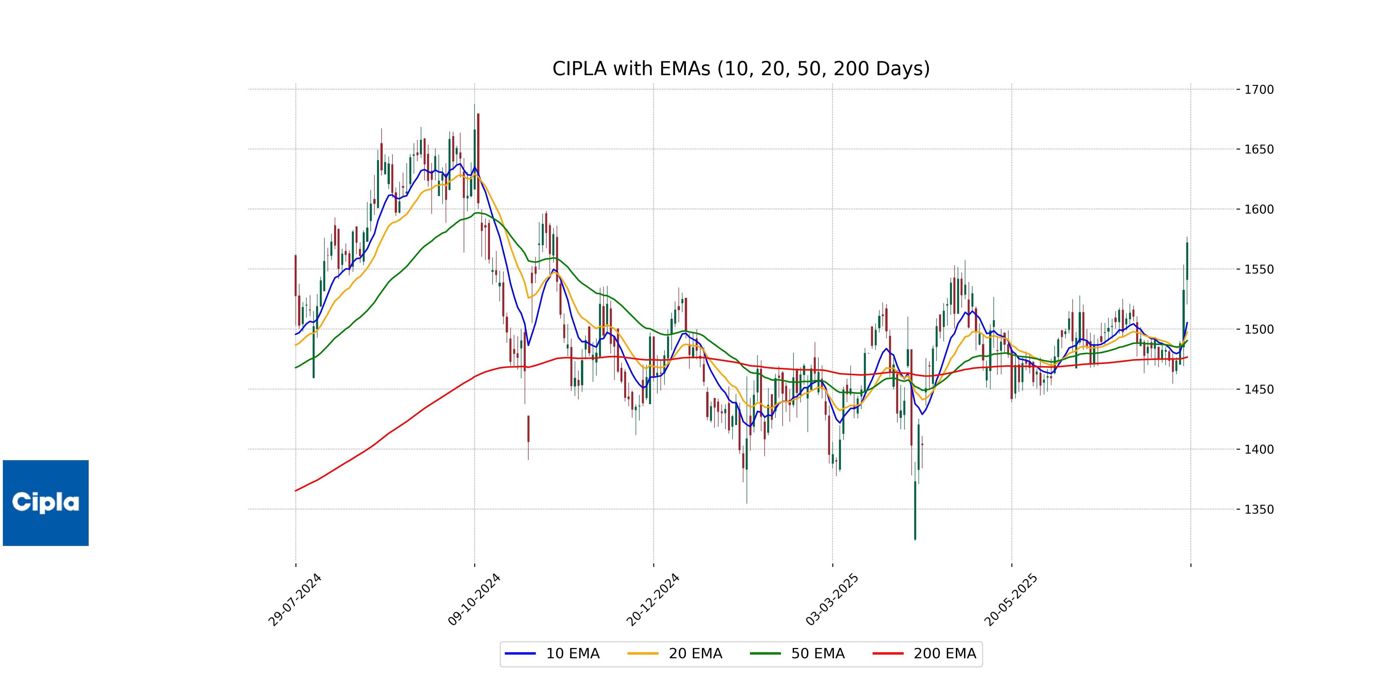 Cipla's current closing price of 1572.0 is above its 50-day EMA of 1490.35 and its 200-day EMA of 1476.60, indicating a strong upward trend. Moreover, the price is significantly above the 10-day EMA of 1505.19 and the 20-day EMA of 1497.30, suggesting short-term bullish momentum.