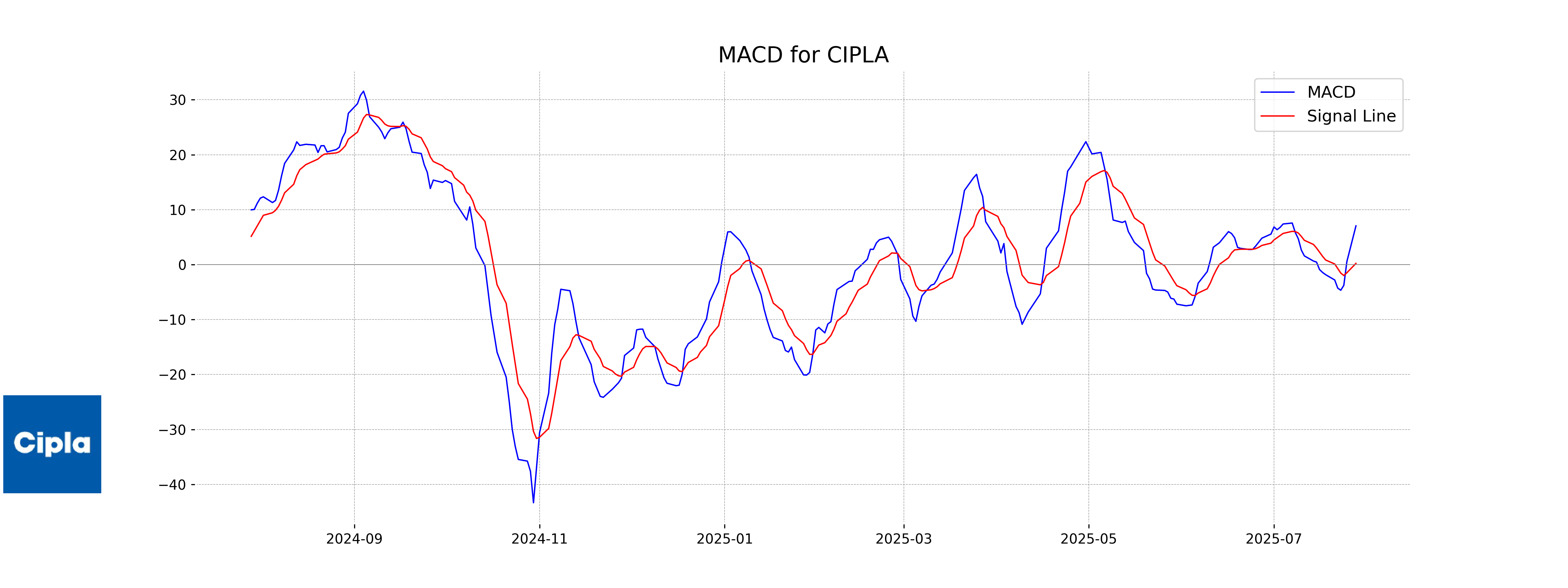 Cipla's MACD Analysis: The MACD value of 7.05 indicates a strong upward momentum in the stock price, as it is significantly above the signal line value of 0.22. This positive MACD crossover suggests a bullish trend, indicating potential for further price appreciation.