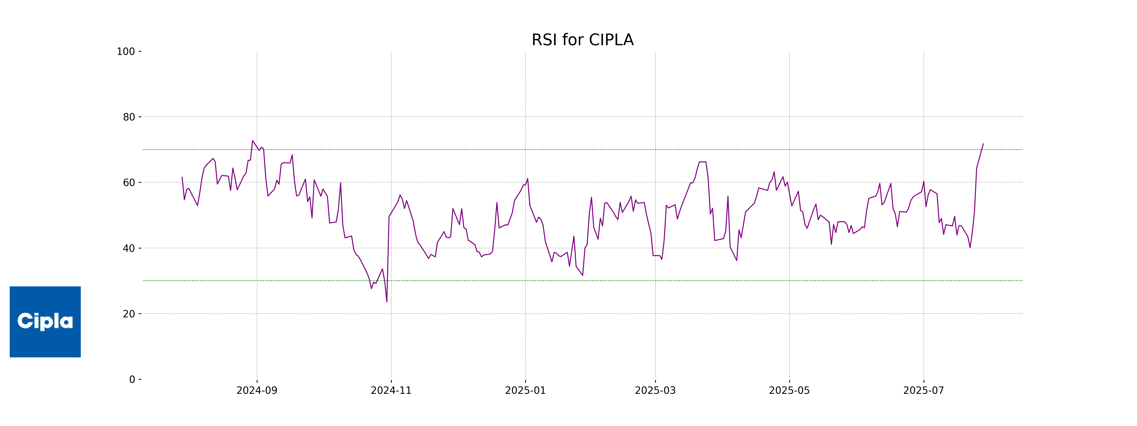 The Relative Strength Index (RSI) for Cipla is 71.72, which suggests that the stock is in overbought territory. This high RSI value indicates that the stock may be experiencing upward momentum, but it could also be a signal for potential price correction or consolidation in the near term.