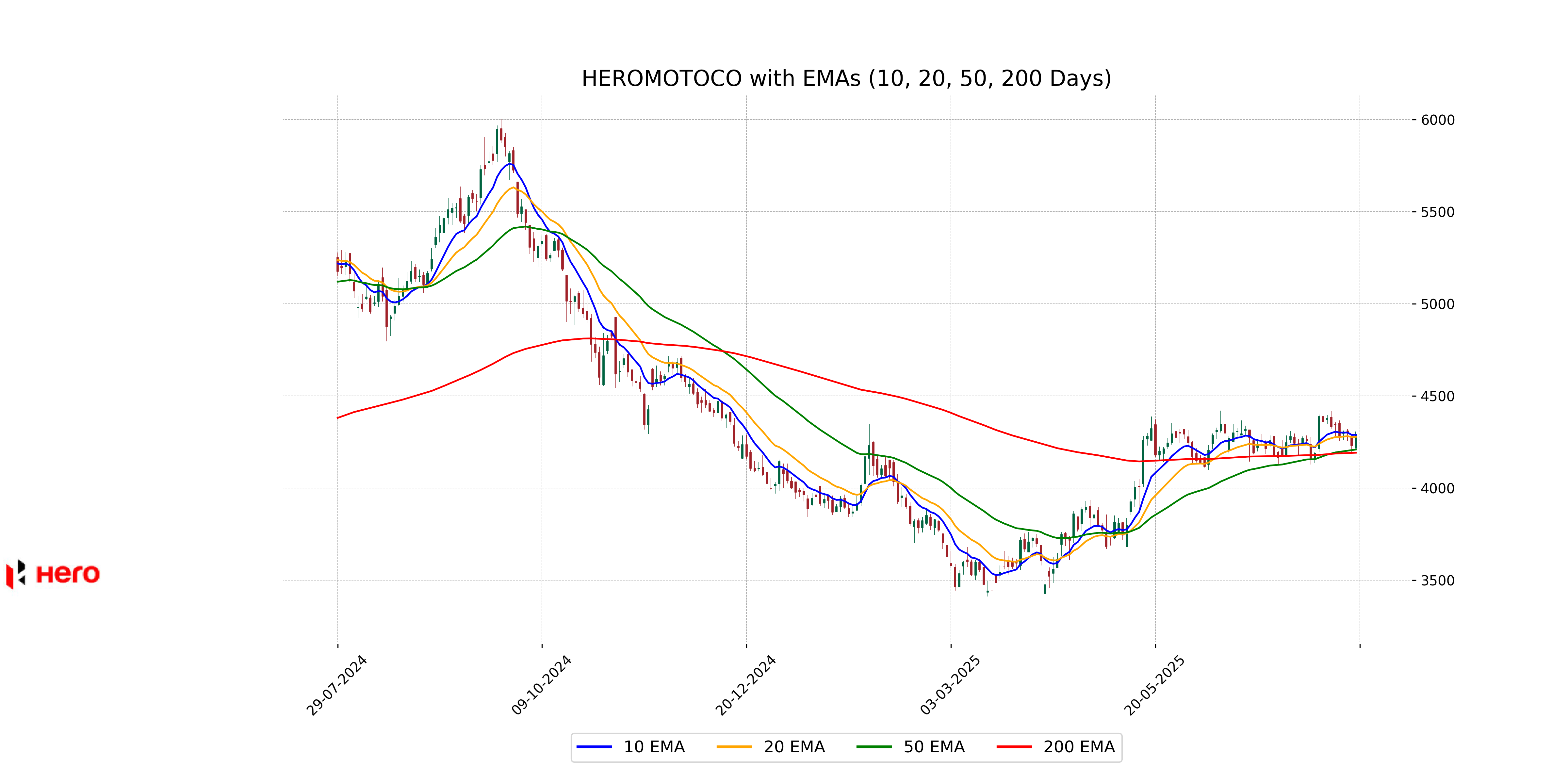 Hero MotoCorp closed at 4291.10, above both its 50 EMA of 4208.42 and 200 EMA of 4191.14, indicating a recent upward momentum. It also closed slightly above its 10 EMA of 4288.39 and 20 EMA of 4277.50, suggesting short-term strength.