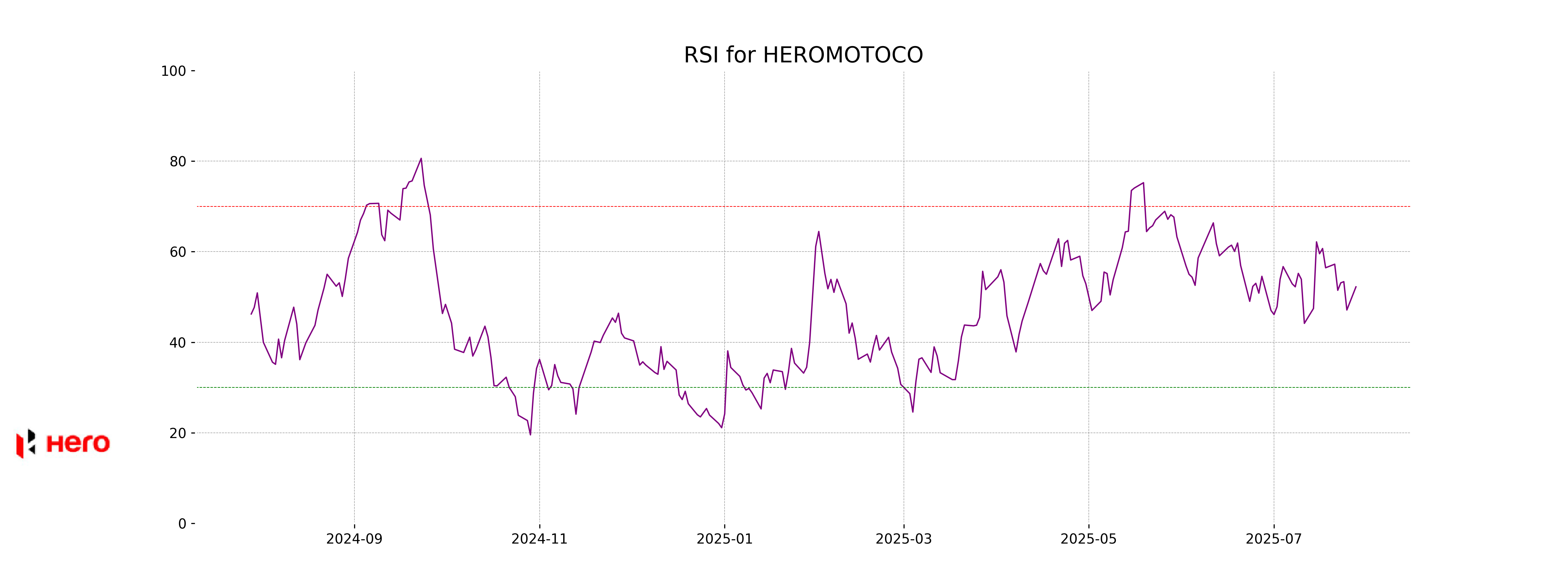 The Relative Strength Index (RSI) for Hero MotoCorp is 52.23, which is typically considered a neutral zone. This indicates that the stock is neither overbought nor oversold at the moment, suggesting balanced momentum.