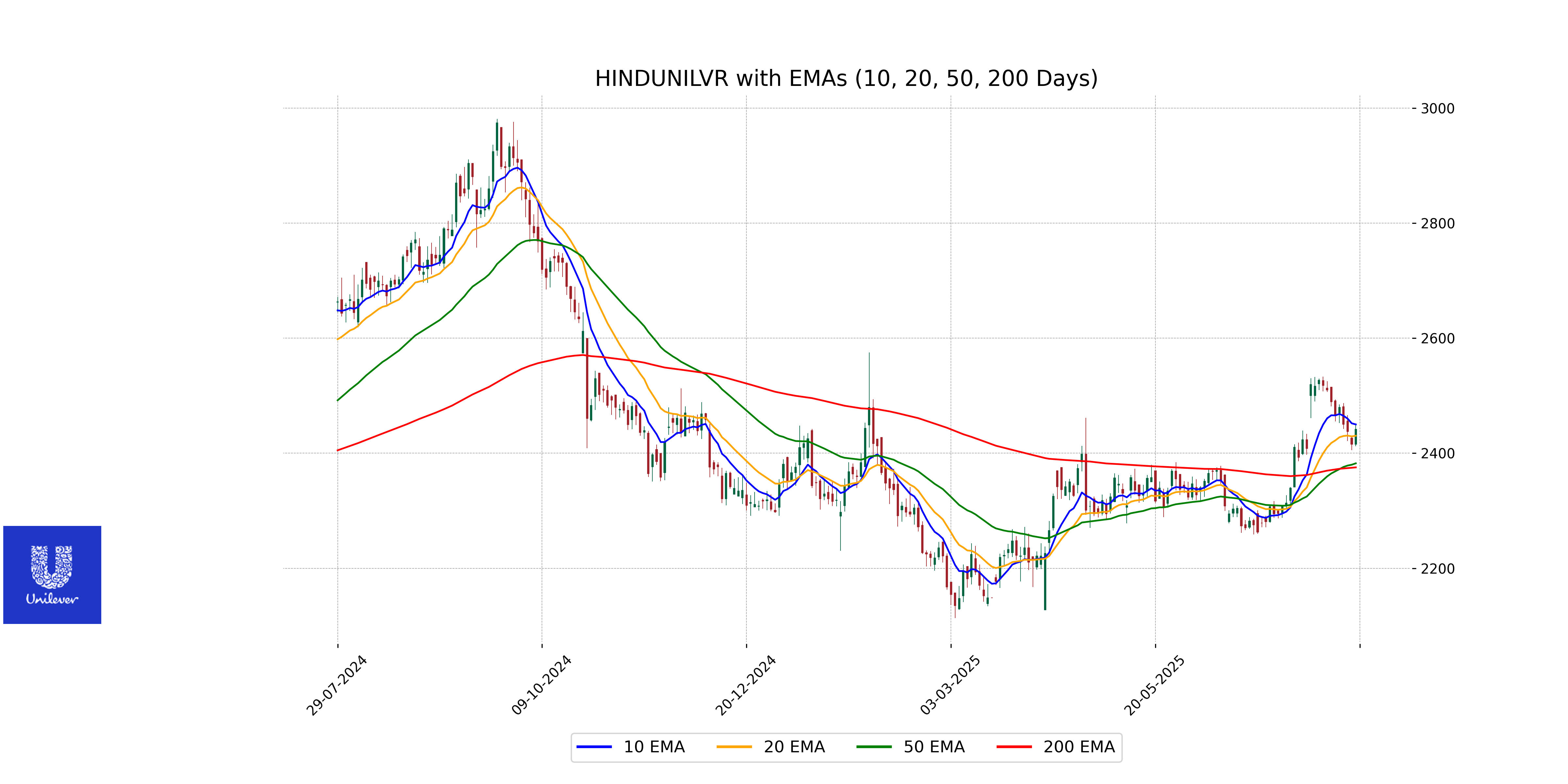 Hindustan Unilever's closing price of 2441.60 is currently above its 50-day EMA of 2382.44 and its 200-day EMA of 2375.42, indicating a potential bullish trend in the long term. However, it is slightly below the 10-day EMA of 2450.08, suggesting near-term resistance.