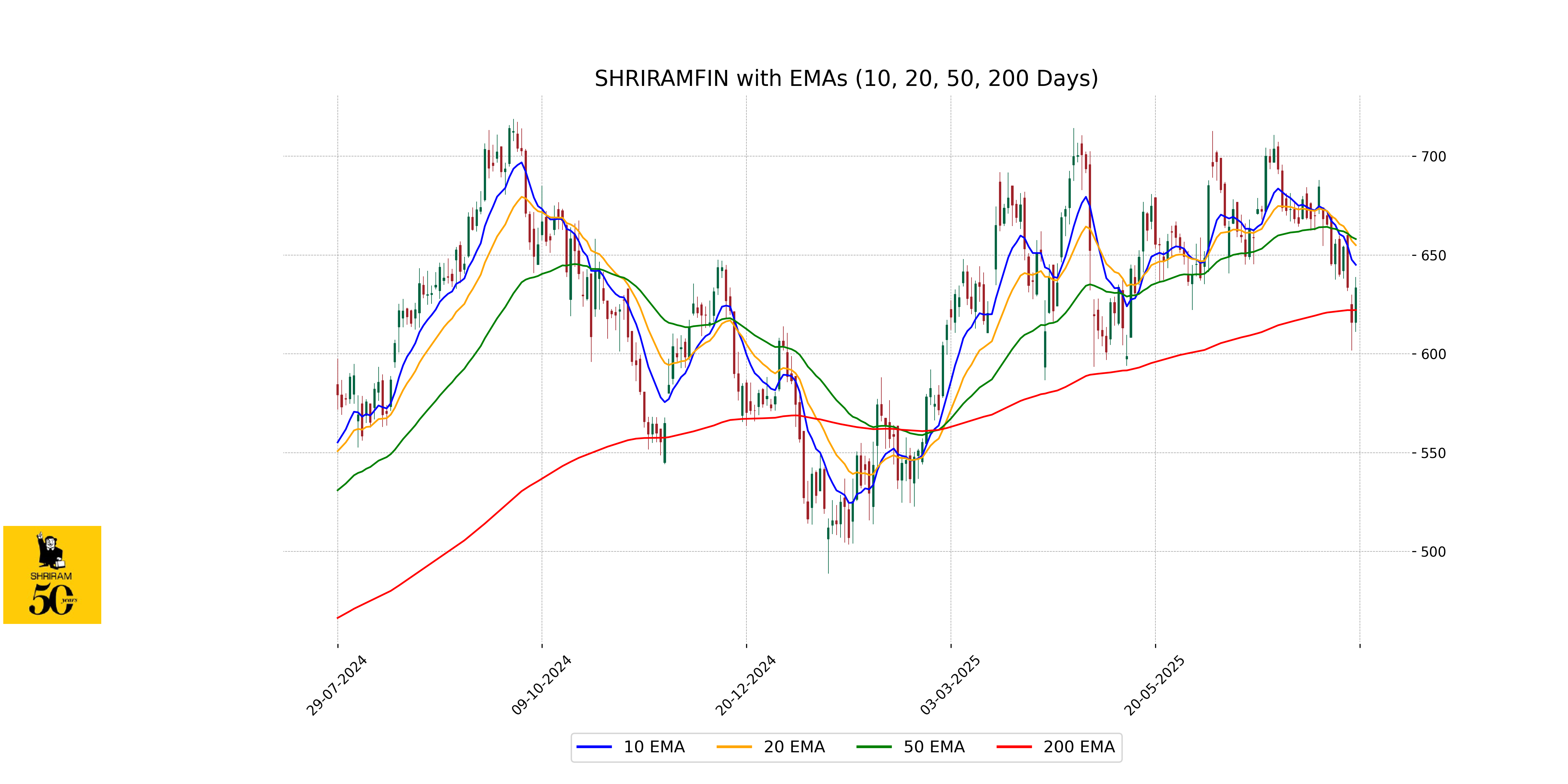 Shriram Finance's recent closing price of 633.45 is below its 50-day EMA of 658.09 and 10-day EMA of 645.06, but above its 200-day EMA of 622.18. This suggests short-term bearish momentum, though it remains above long-term support levels.