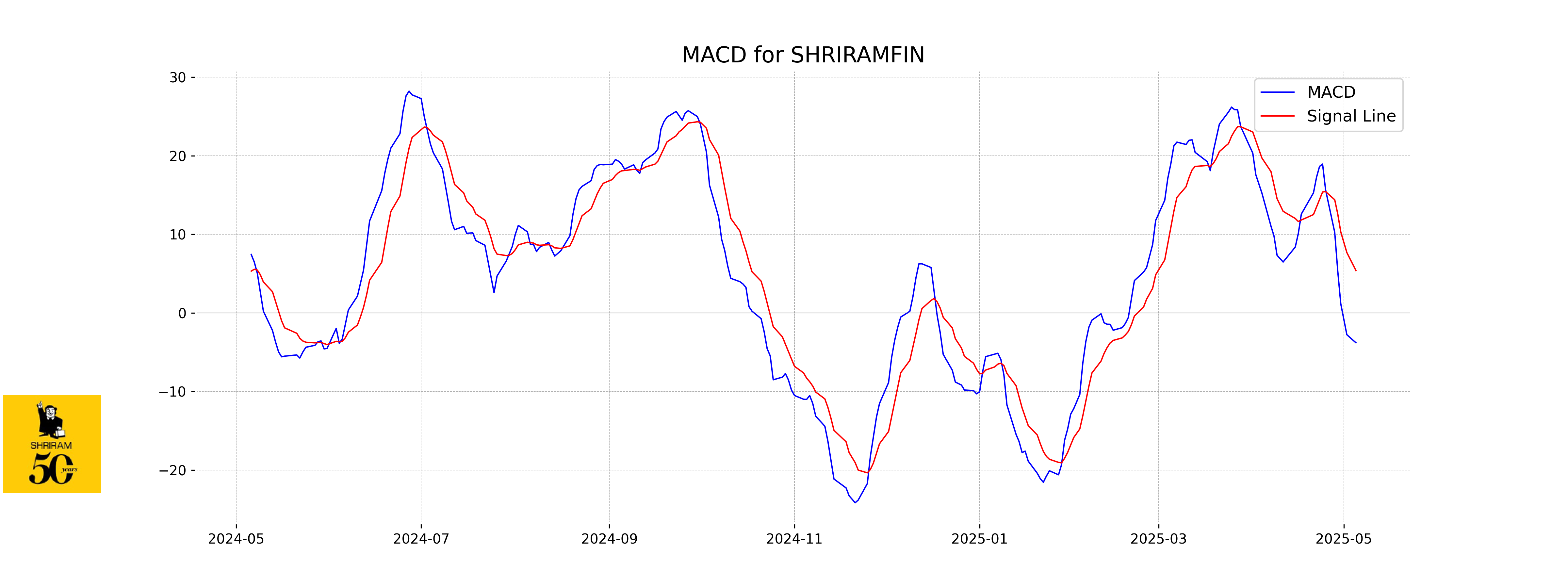 MACD Analysis for Shriram Finance: The MACD for Shriram Finance is currently at -3.80 with a MACD Signal of 5.39. This indicates a bearish trend as the MACD line is below the Signal line, suggesting potential downward momentum.