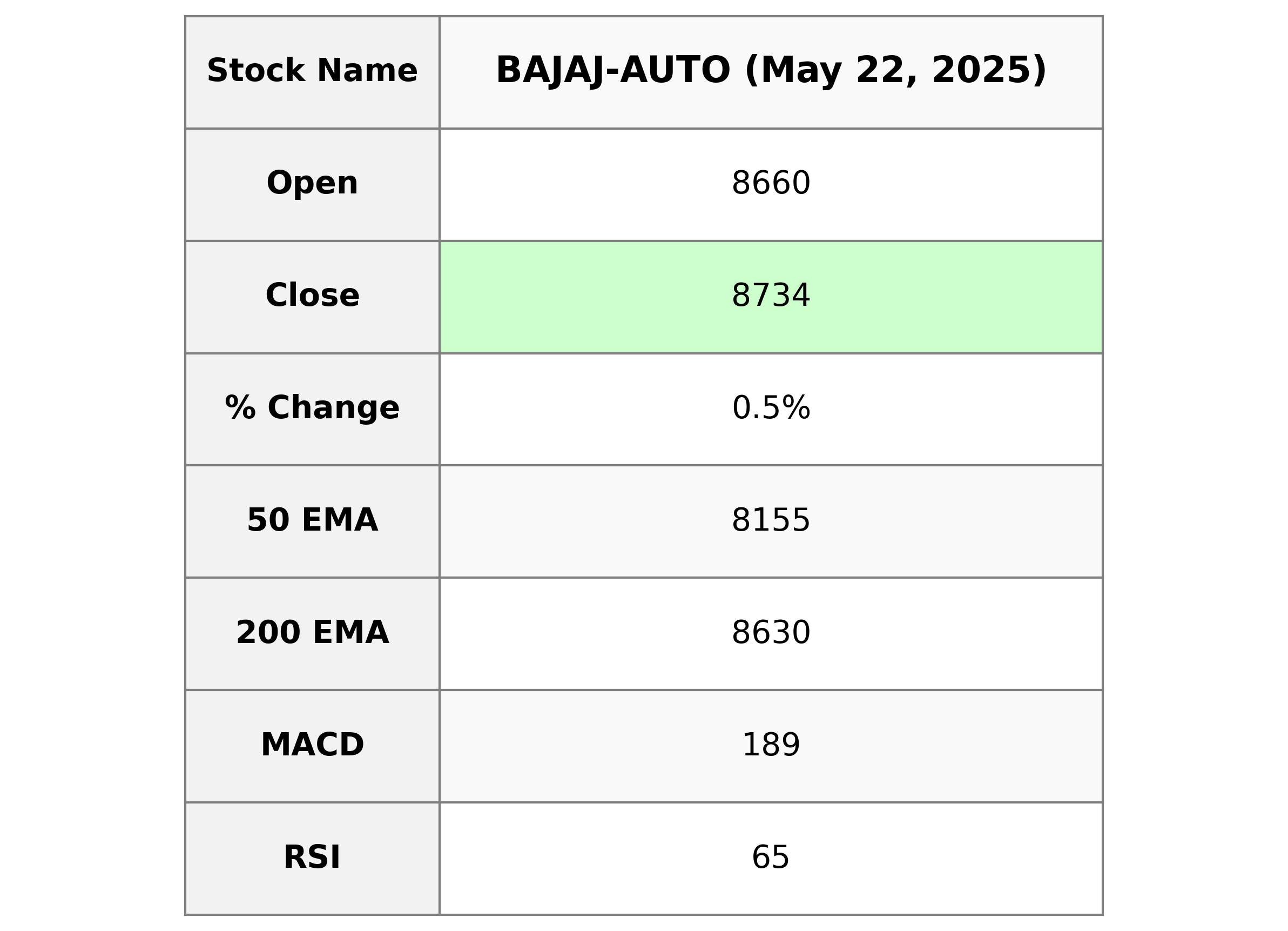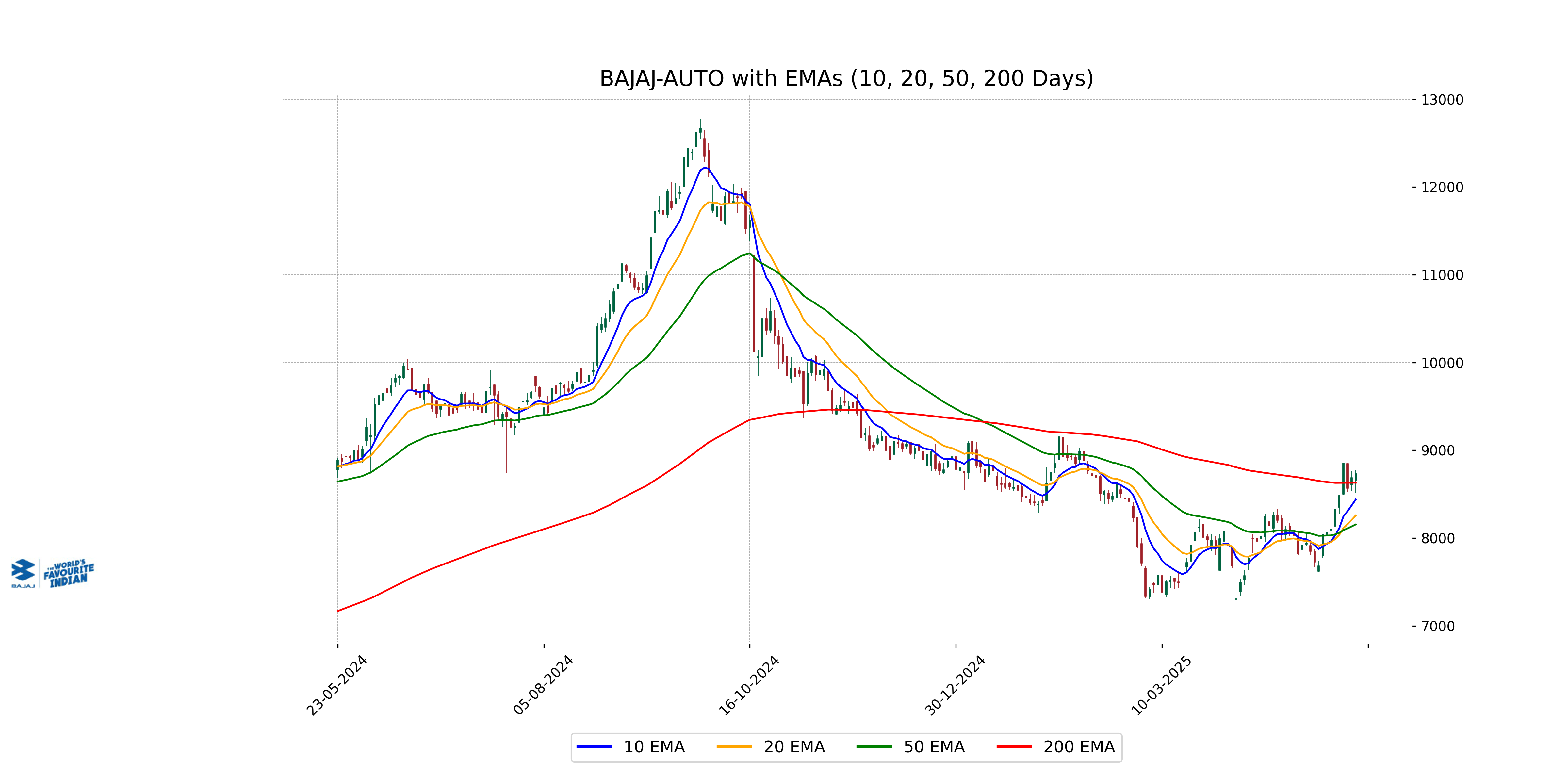 Bajaj Auto Performance Bajaj Auto closed at 8733.5, marking a 0.53% increase from its previous close, with a trading volume of 916,593 shares. The stock currently trades above its 50-day and 200-day EMAs, indicating a bullish trend. With a Market Cap of approximately 2.44 trillion INR and a PE Ratio of 32.43, Bajaj Auto is positioned strongly within the Consumer Cyclical sector, particularly in Auto Manufacturing in India.