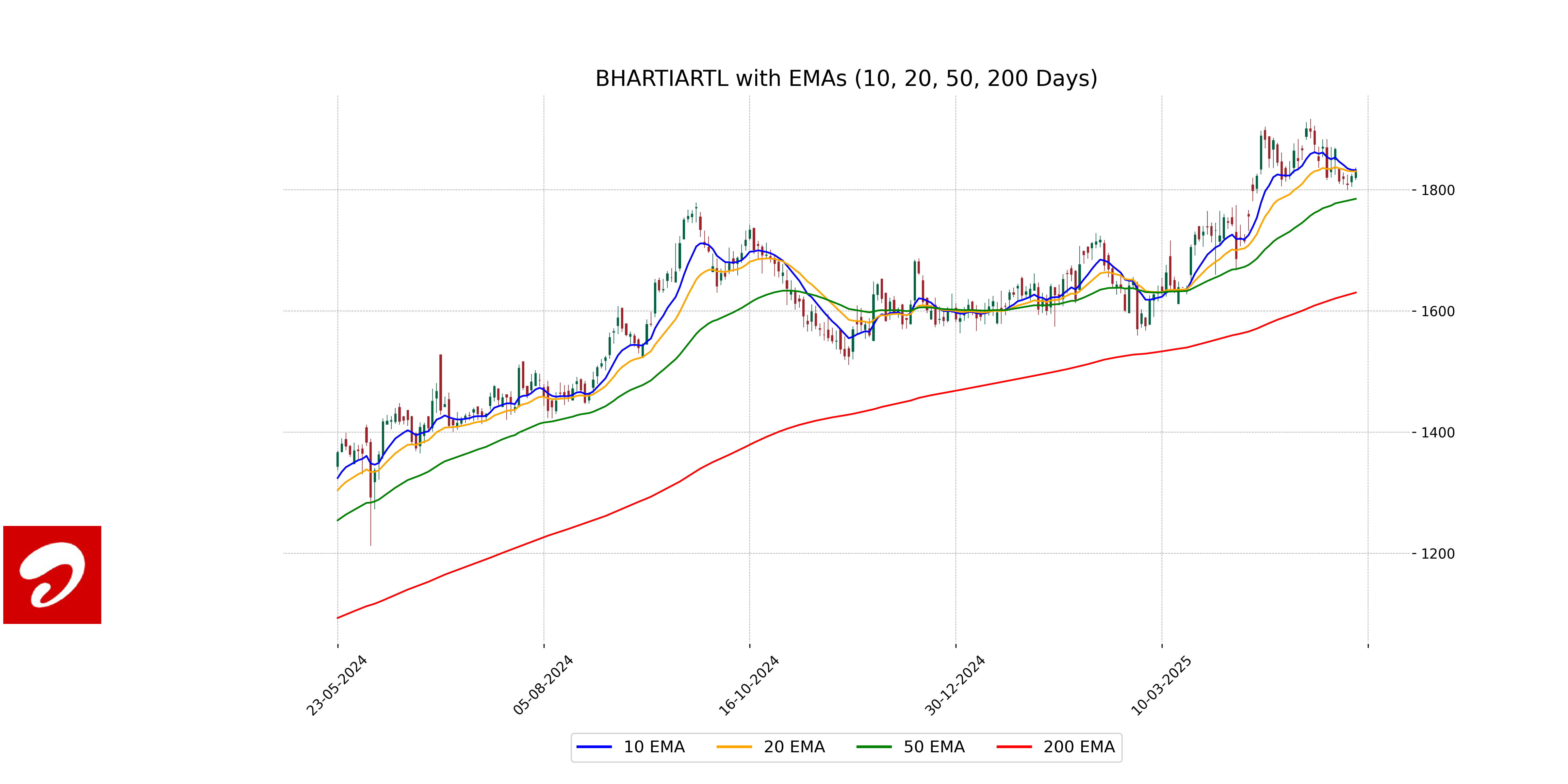 Bharti Airtel's current closing price of 1831.40 is above its 50-day Exponential Moving Average (EMA) of 1785.29 and significantly higher than its 200-day EMA of 1630.53, indicating a bullish trend over the long term. However, it is slightly below the 10-day EMA of 1832.76 and above the 20-day EMA of 1830.69, reflecting short-term support around these levels.