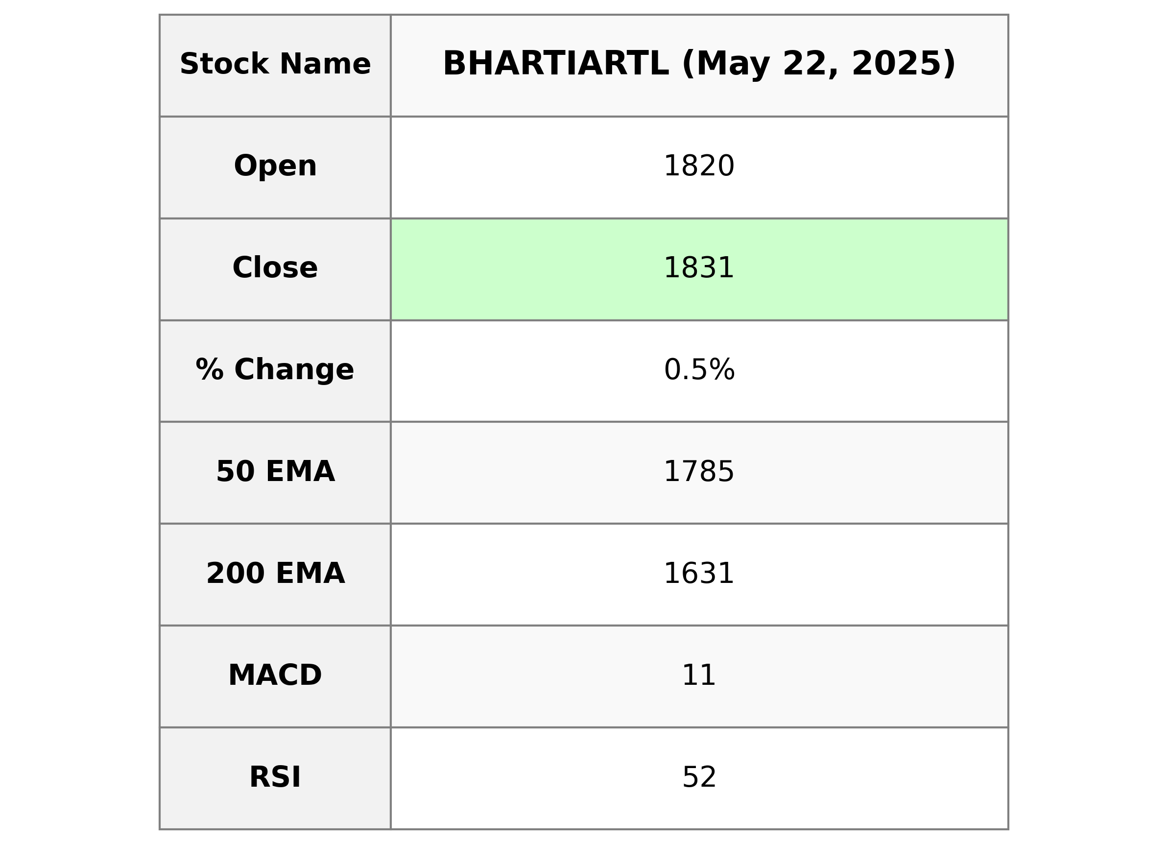 Bharti Airtel Performance Overview Bharti Airtel experienced a slight increase in stock price with a closing at 1831.40, marking a percentage change of 0.49%. The company, operating in the Communication Services sector of the Telecom Services industry in India, holds a market cap of 10,974,701,551,616 INR and a PE ratio of 32.73. The RSI of 51.72 suggests a balanced momentum, while the stock's recent performance has edged above both the 50-day and 200-day EMA, indicating a gradual upward trend.